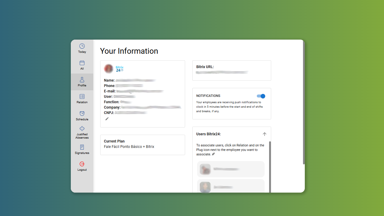Allows you to record entries, breaks and departures considering the determinations of the Ministry of Labor (for Brazil) and employment regarding overtime and tolerances, as well as all absences and fully integrated with Bitrix24 (To record the start of work, requires Professional version or higher). You can also activate notifications for your users, and after the month's validations, send time cards for electronic signature with legal validity, with monitoring by the panel of who signed or not.