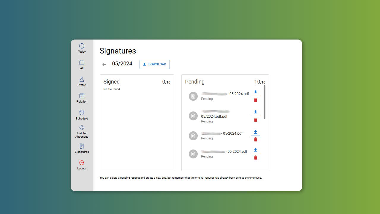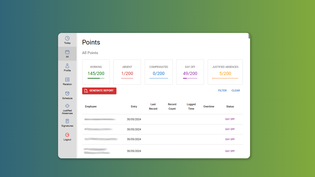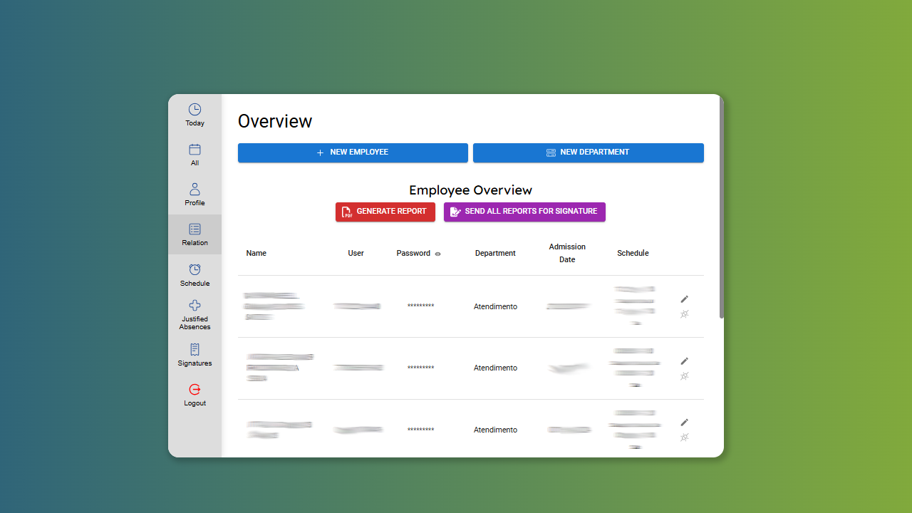 Generation of reports in PDF with the possibility of sending them for electronic signature with legal validity via WhatsApp or email after validations, eliminating the need for physical timesheet files, and granting simplified access to all records for your team.