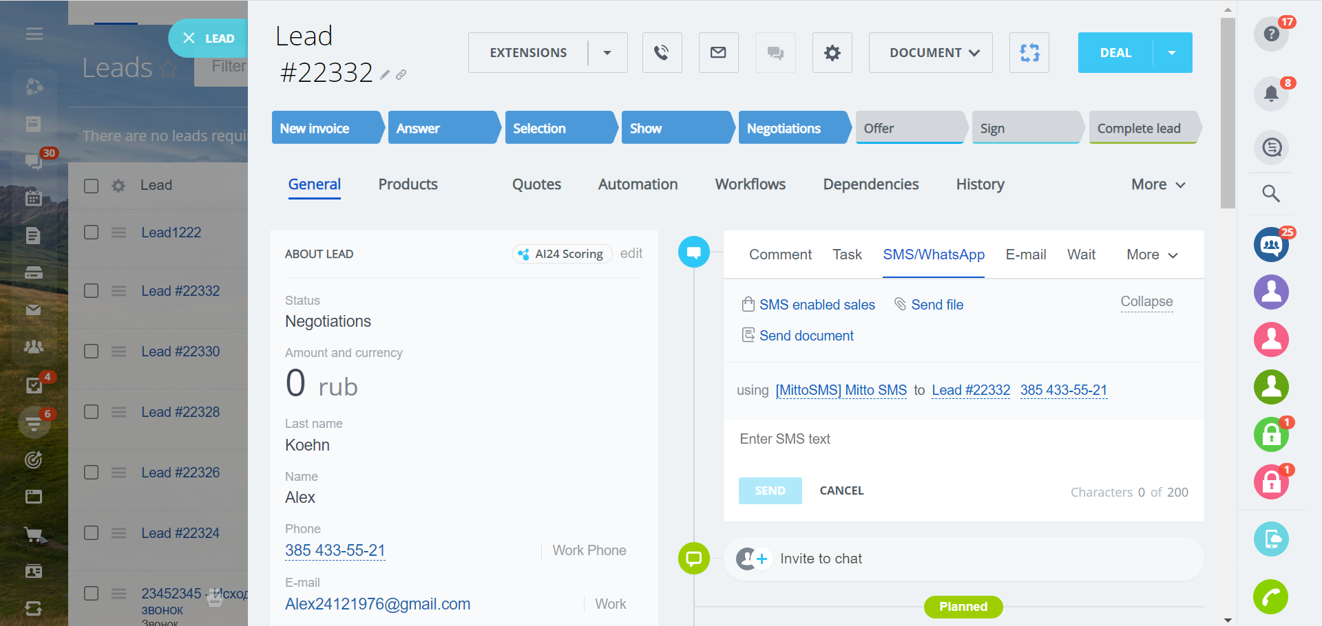 - SMS send-out directly from Lead, Deal, Contact — Trigger it by Bitrix24 Automation rules for all leads or deals.