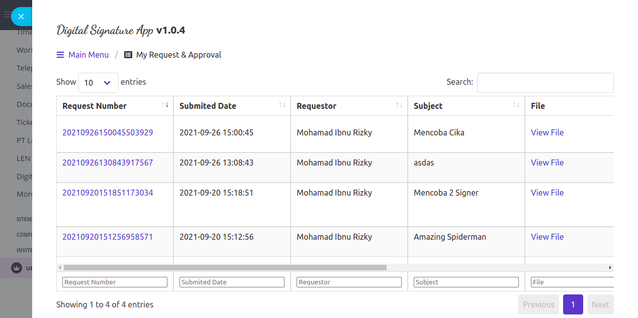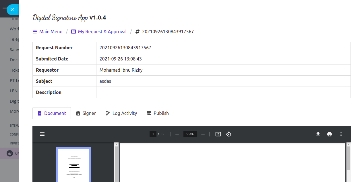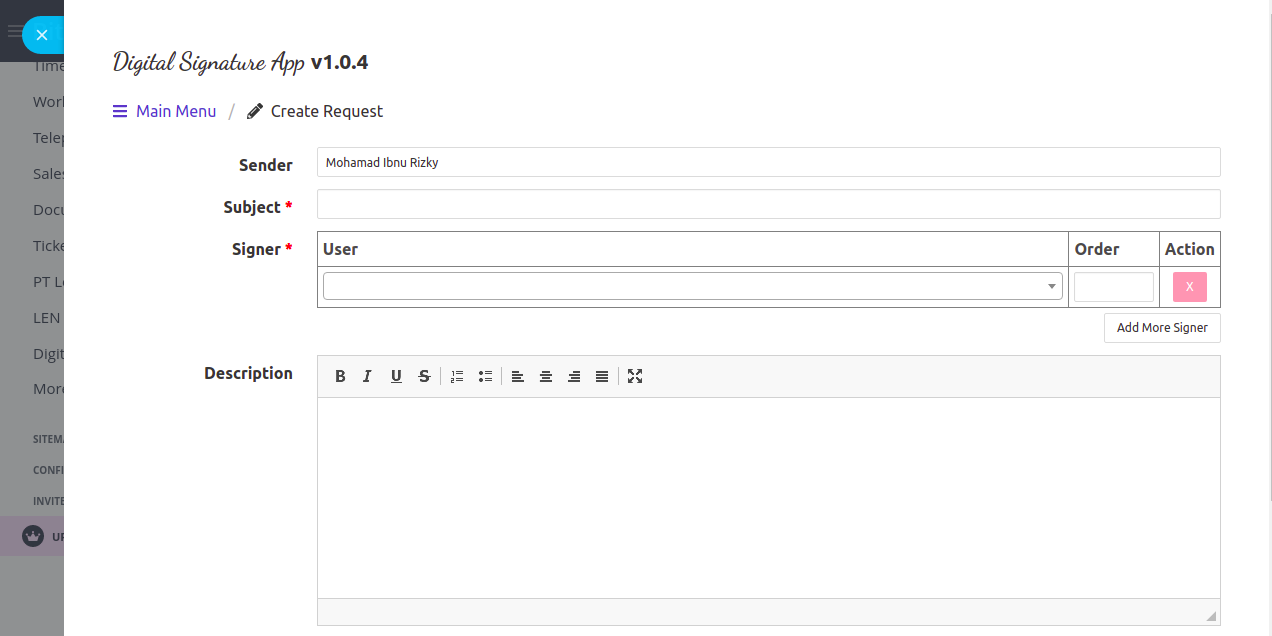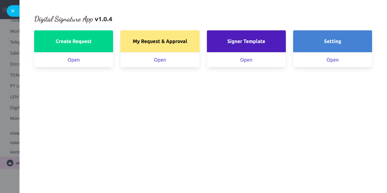 - There are 3 main menus: create request, my request & approval, Signer Template.