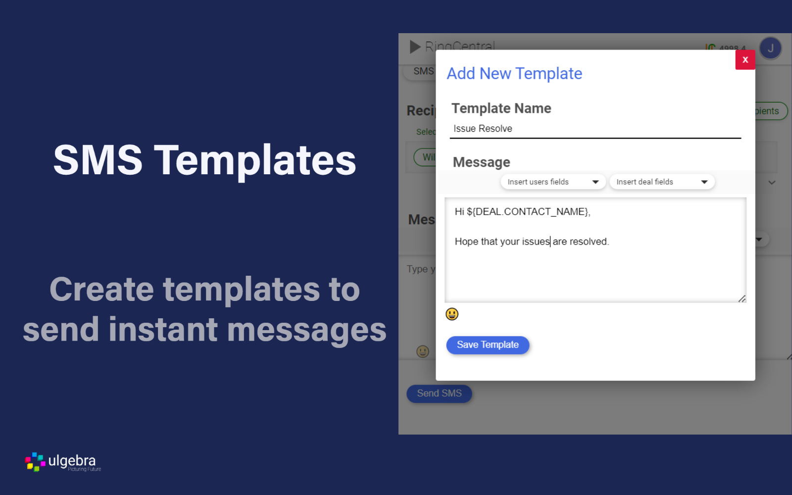 Wählen Sie in jedem Lead, Kontakt oder Geschäft RingCentral im oberen Bereich aus. Wählen Sie den Absender Ihrer Nachricht aus, geben Sie die Nachricht ein oder fügen Sie eine Vorlage hinzu und klicken Sie auf SMS senden. Sie können auch mehrere Kontakte hinzufügen, indem Sie die Option „Empfänger hinzufügen“ verwenden, um Kontaktnummern einzufügen oder nach einem bestimmten CRM-Kontakt zu suchen. Fügen Sie auch Emojis, Benutzerfelder und Lead-/Kontakt-/Deal-Felder ein.