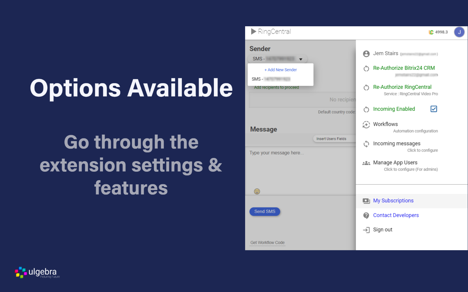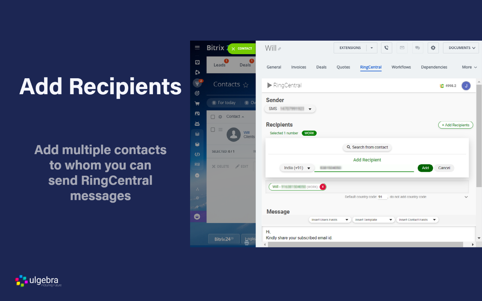 Wählen Sie RingCentral SMS for Bitrix24 aus dem CRM-Menü auf der linken Seite. Wählen Sie den SMS-Absender aus und klicken Sie auf „Empfänger hinzufügen“. Wählen Sie die Landesvorwahl aus, geben Sie die erforderliche Kontaktnummer ein und klicken Sie auf „Hinzufügen“. Ebenso können mehrere Kontakte hinzugefügt werden, um Massennachrichten zu senden. Geben Sie einen Standard-Ländercode ein und wählen Sie die entsprechenden Einstellungen aus der Dropdown-Liste aus. Geben Sie die Nachricht zusammen mit Benutzerfeldern und Emojis ein oder wählen Sie eine Vorlage aus. Klicken Sie auf „SMS senden“.