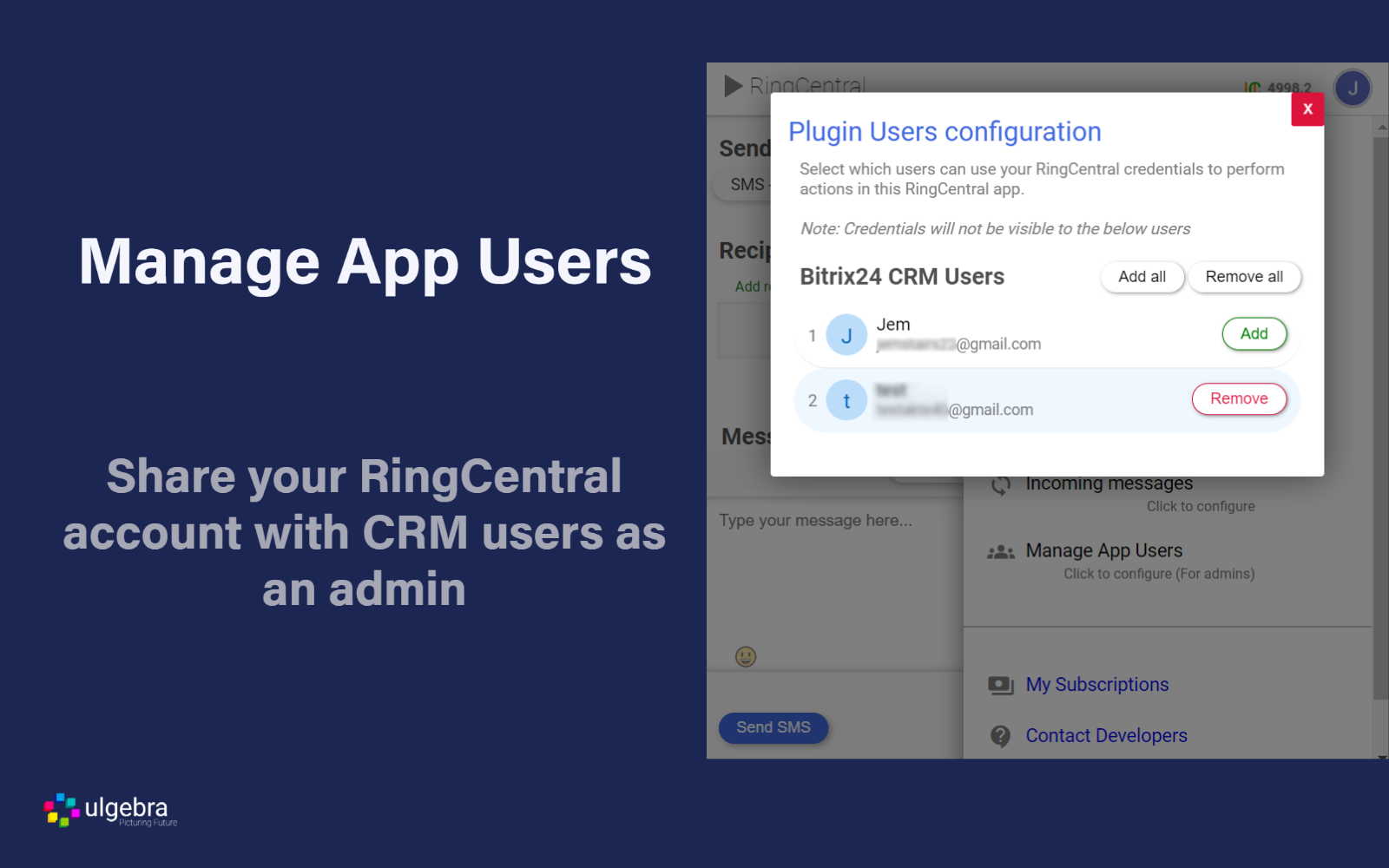 Wählen Sie im Erweiterungsprofil „App-Benutzer verwalten“. Der CRM-Administrator kann diese Funktion verwenden, um es den Benutzern zu ermöglichen, das RingCentral-Konto auf dem Administrator während der Erweiterungsinstallation innerhalb des Bitrix24 des Benutzers zu autorisieren.