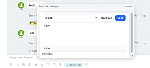 Multilingual support — the agent enables the translator, sends an adapted reply, and the entire conversation is stored in CRM.