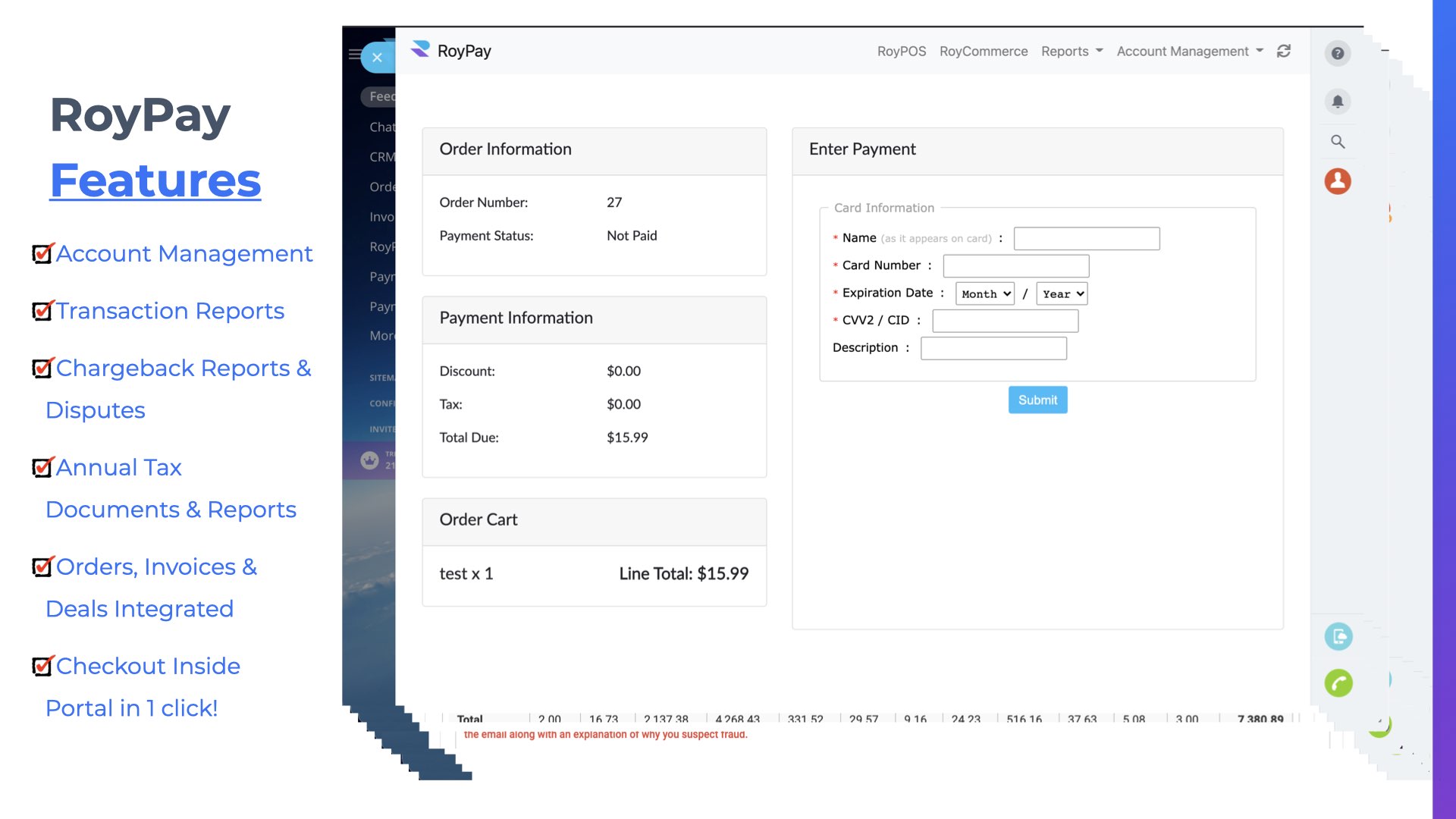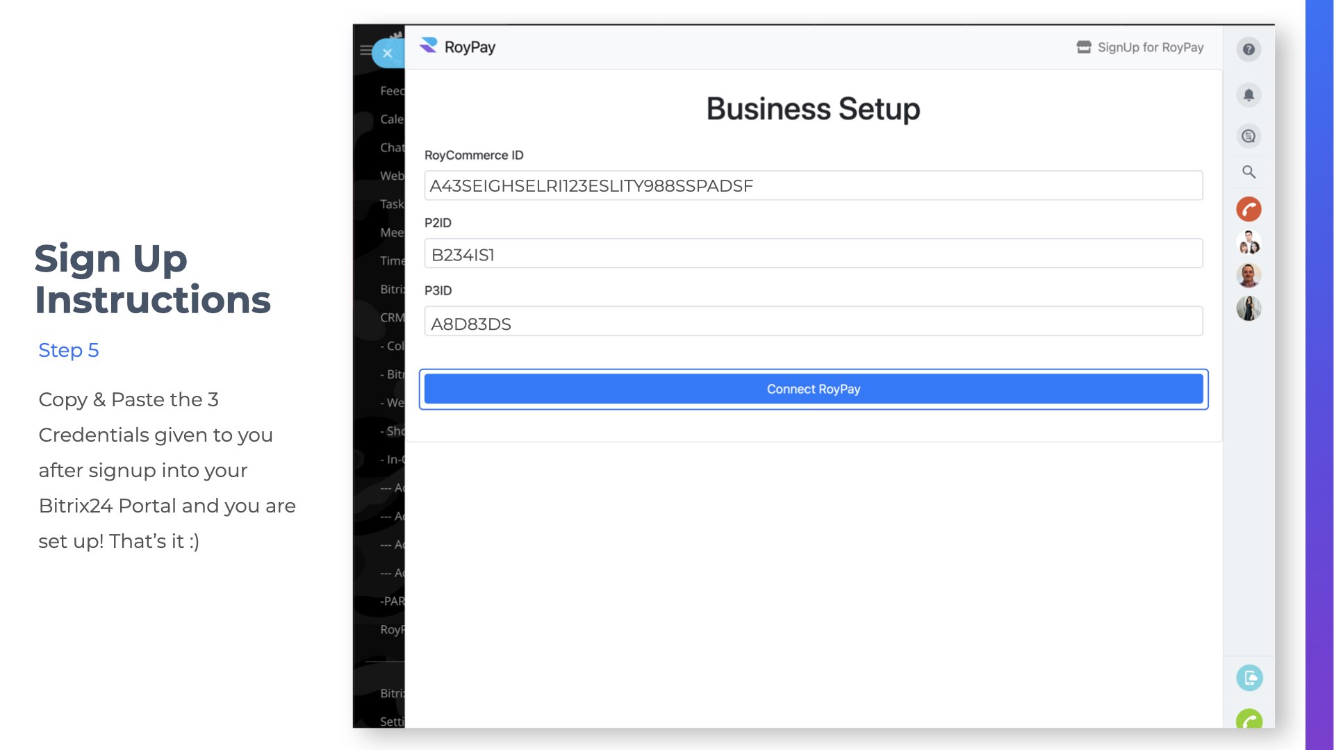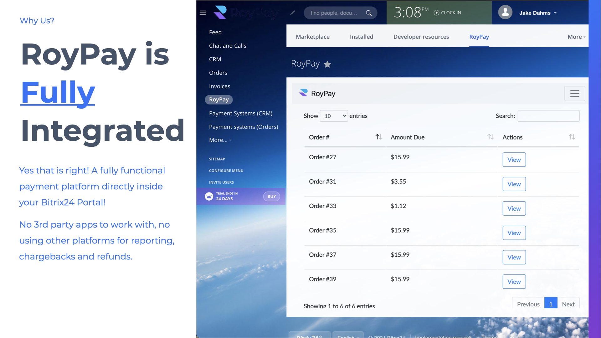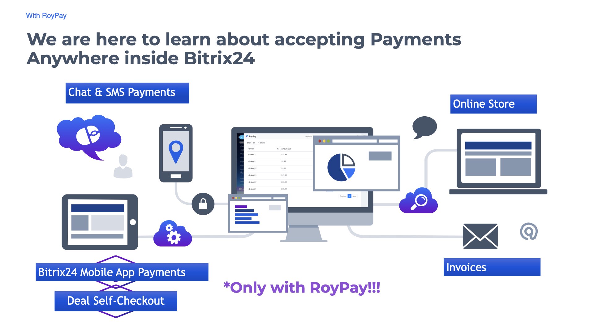 No 3rd party apps to work with, no using other platforms for reporting, chargebacks and refunds. Everything is accessible from the RoyPay Bitrix24 App!