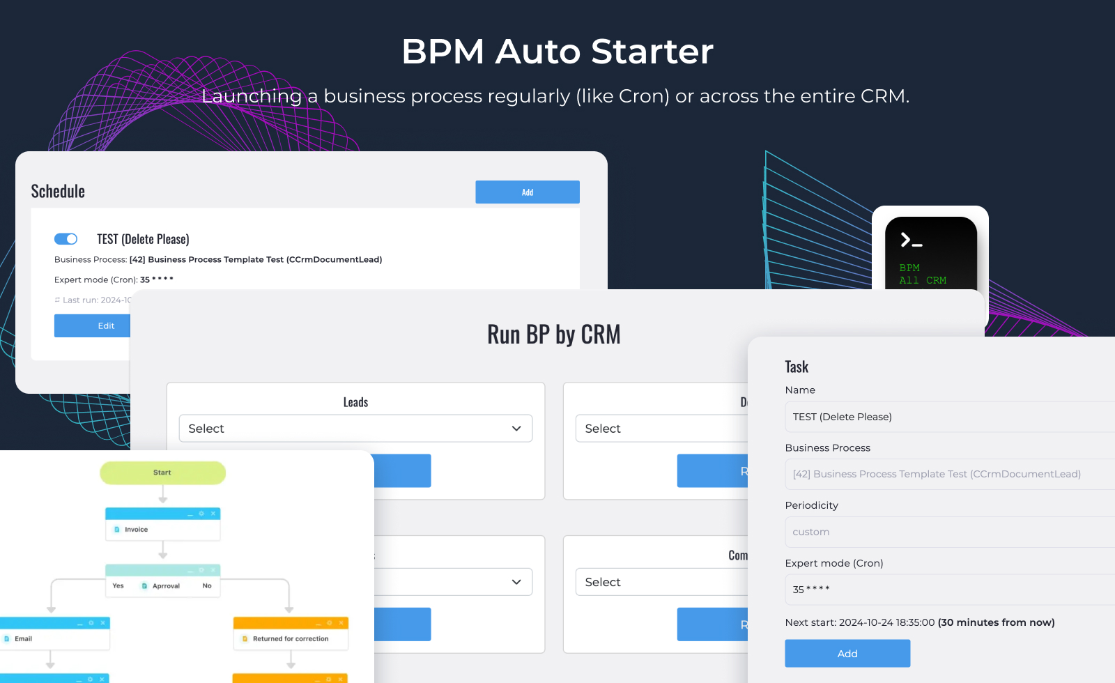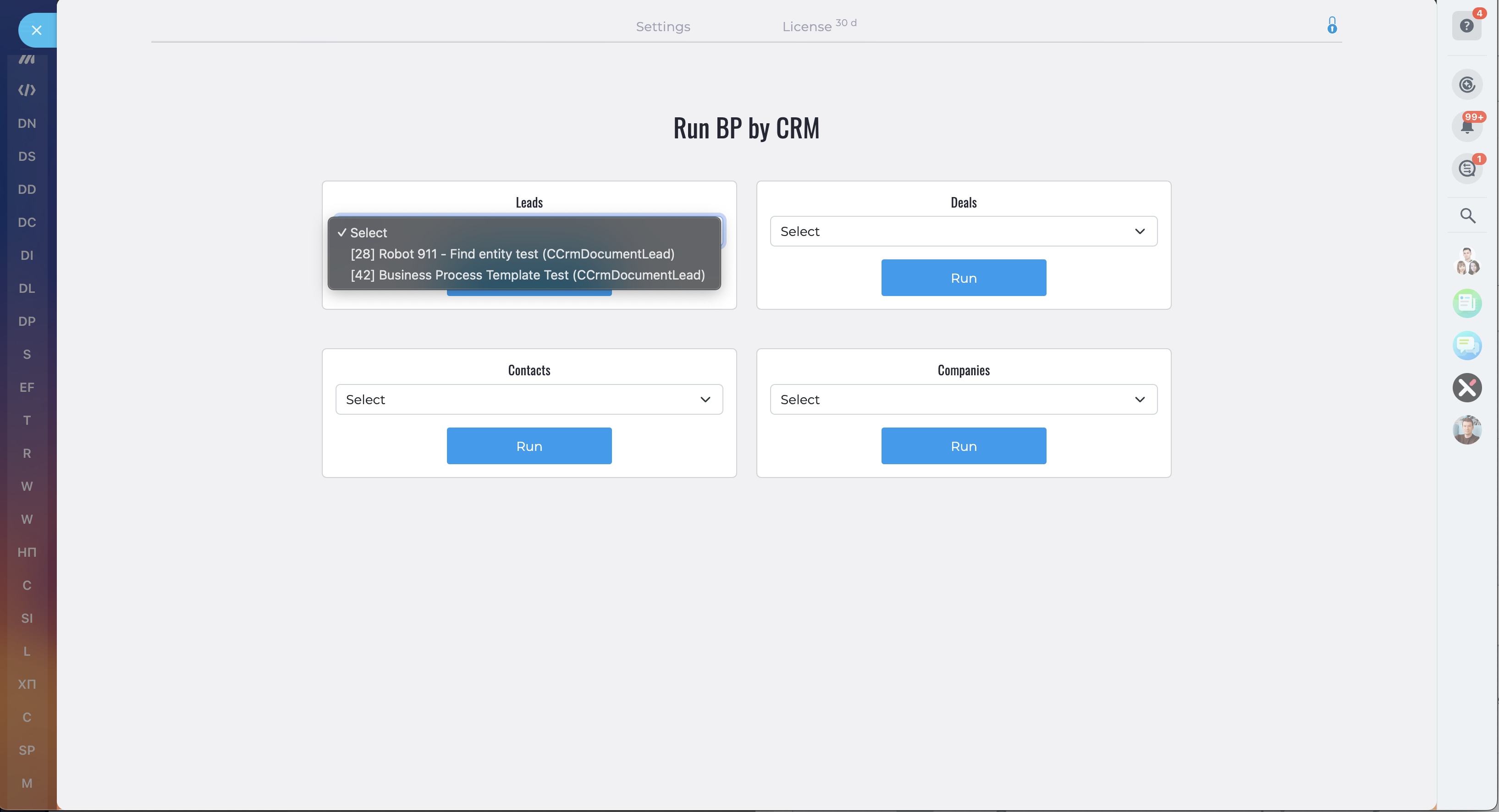 An application for bulk launching business processes across the entire CRM database (leads, deals, contacts, companies). It fully automates working with large volumes of data.