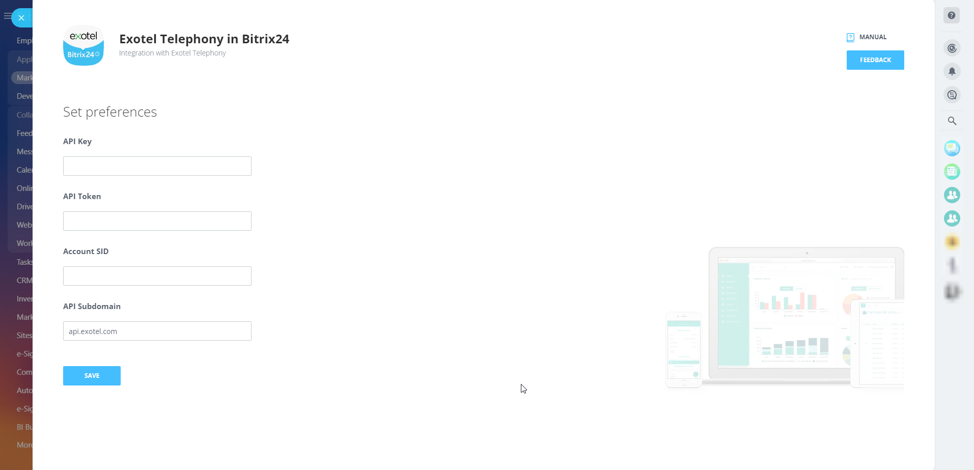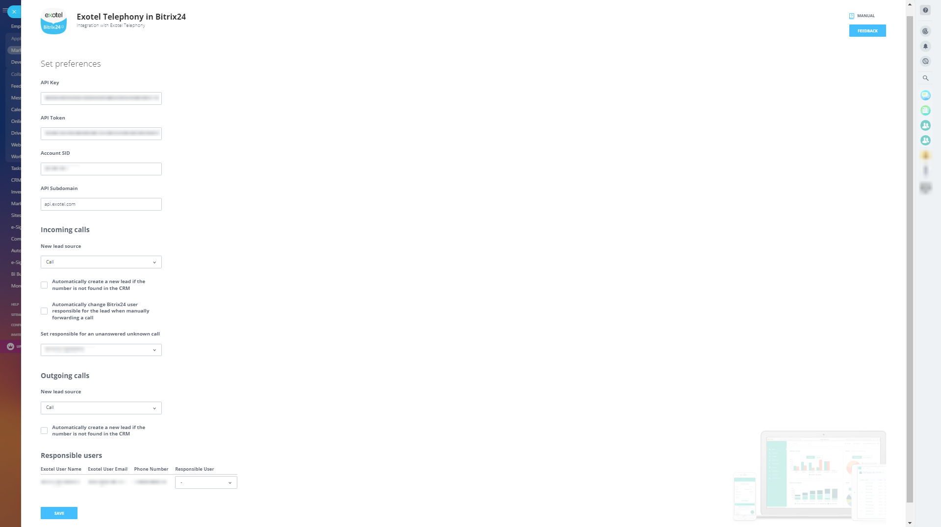 - Registered inbound calls and automatic generation of leads/contacts/deals depending on Bitrix24 settings;