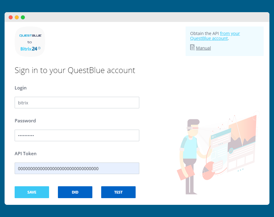 Actively using SMS? Questblue now works with SMS directly inside Bitrix24! Questblue integration allows automating your business by connecting SMS with automation rules, workflows, CRM details and CRM Marketing. Now you can create a fully automatic sales funnel using popular Questblue SMS. Now SMS messages will be automatically sent from Bitrix24 account exactly when needed. Make your employees everyday routine easier!