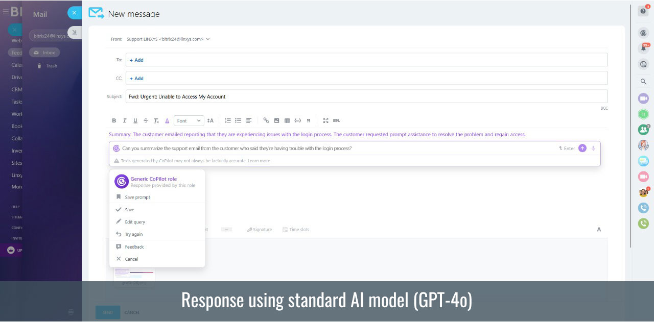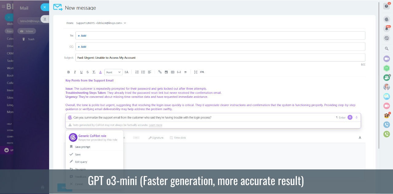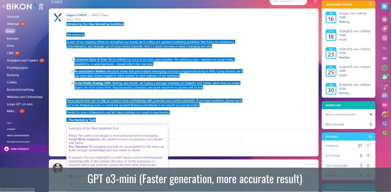 With LINXYS GPT o3-mini, you can generate professional texts in seconds—whether for email replies, task descriptions, or CRM notes. The model delivers precise formulations directly in CoPilot, significantly reducing manual effort.