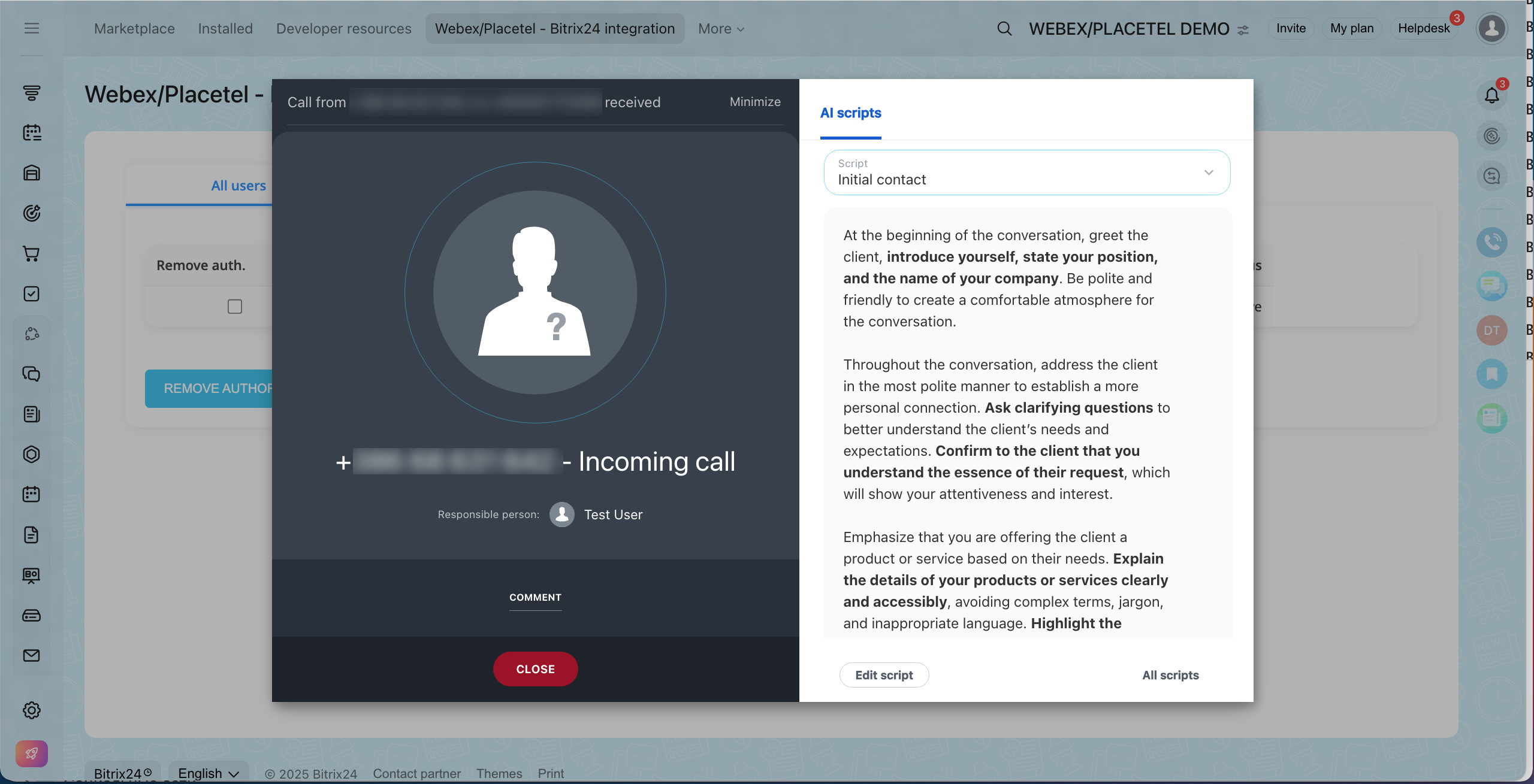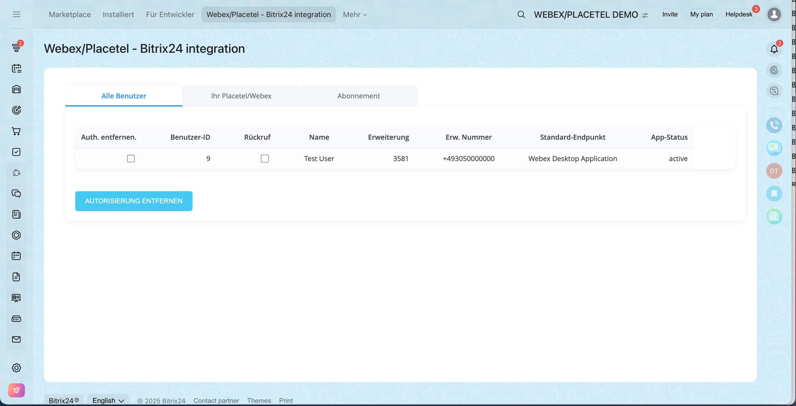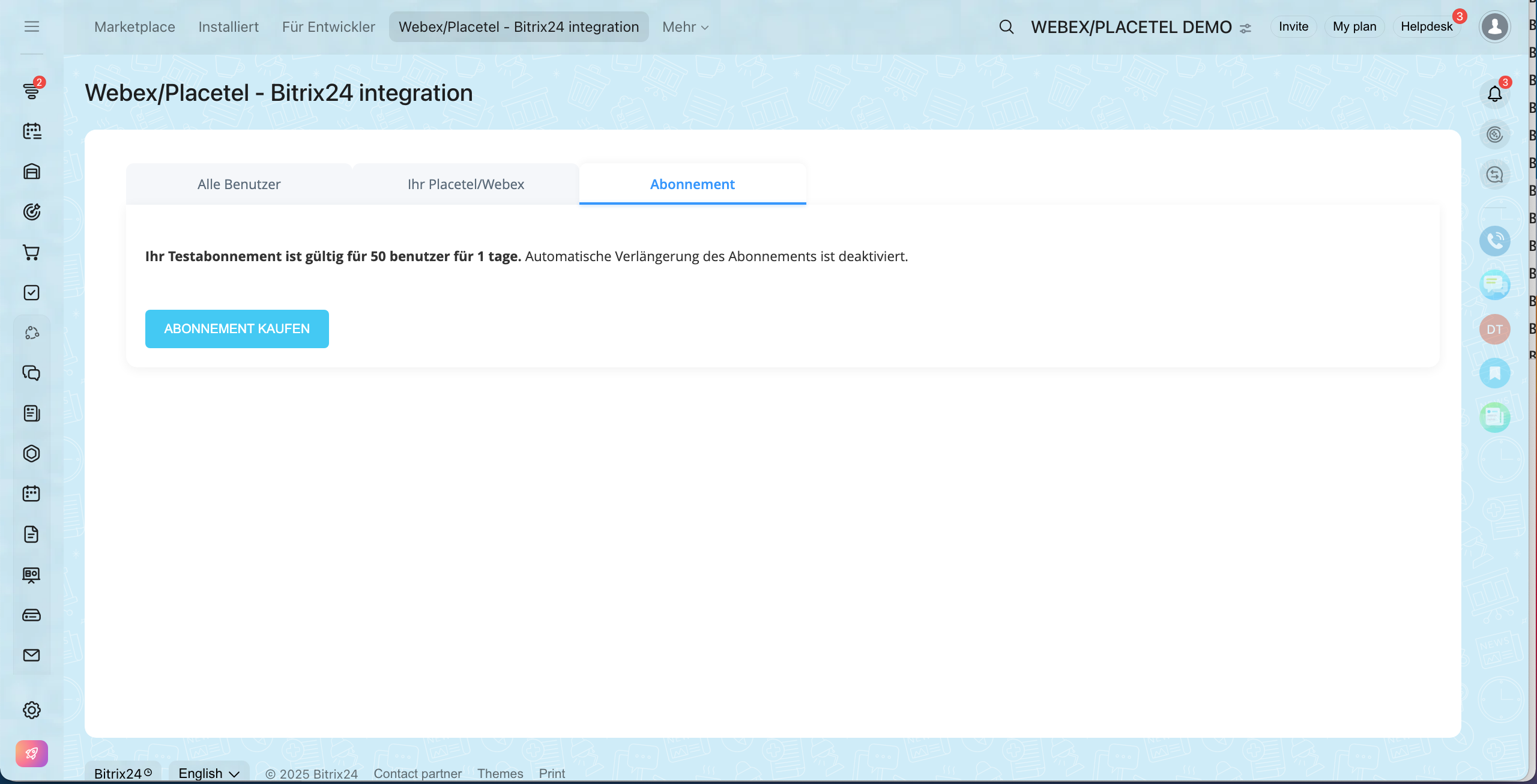 Optimieren Sie Ihre Geschäftskommunikation, indem Sie Ihr Webex- (www.webex.com) oder Placetel- (www.placetel.de) Telefonsystem mit Bitrix24 verbinden. Diese App integriert Telefoniefunktionen nahtlos in Ihr CRM und unterstützt Ihr Team dabei, effizienter zu arbeiten und schneller Abschlüsse zu erzielen.