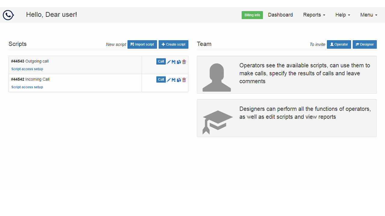 A sales script designer with easy integration into your CRM-system. Ready-made script templates allow you to start making calls in a few minutes.