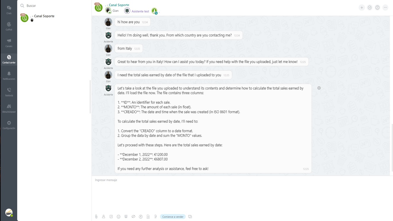 - Wenn Sie die Aktion "Gesprächszusammenfassung" aktivieren, kann der Assistent, wenn Sie ihm in Ihrer Anweisung sagen, er solle eine nach Name, Nachname, Telefonnummer, besprochenem Thema oder einem anderen Format geordnete Zusammenfassung erstellen, diese Informationen im Kommentarfeld speichern, sodass Ihr Berater eine Zusammenfassung dessen lesen kann, was der Bot besprochen hat.