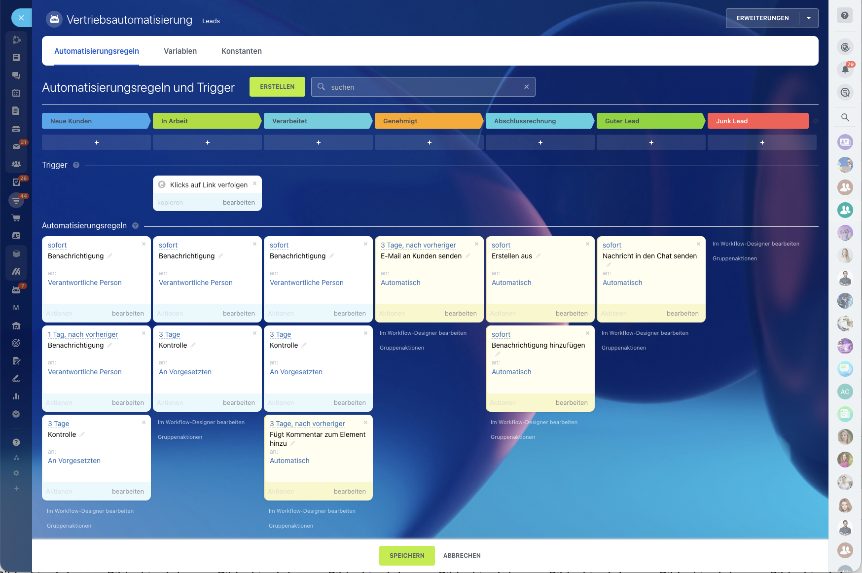 Optimieren Sie Ihre Arbeitsabläufe und automatisieren Sie Geschäftsprozesse mit Bitrix24! Sparen Sie Zeit, Geld und Arbeitskraft bei Routinevorgängen, indem Sie unsere einfach einzurichtenden Automatisierungsregeln und Trigger verwenden.