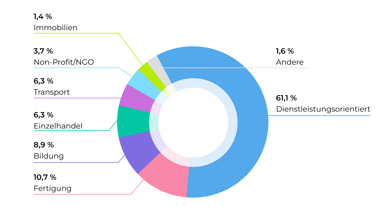 Die Nutzerbasis von Bitrix24 besteht größtenteils aus dienstleistungsorientierten Unternehmen, die 61,1 % der Kunden der Plattform ausmachen. Diese dominante Präsenz unterstreicht die Ausrichtung der Marke auf Branchen, die eine reibungslose Zusammenarbeit, Projektmanagement und Kundenbeziehungsmanagement benötigen.