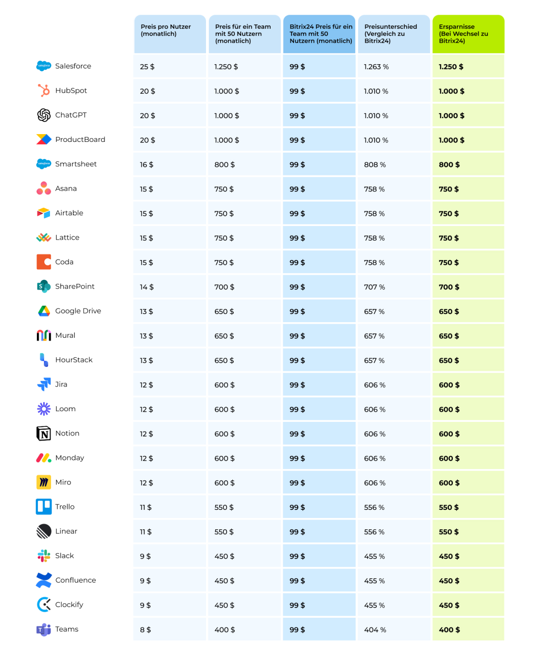 Um den Vergleich deutlicher zu machen, wurden alle unterschiedlichen Preismodelle in der unten stehenden Tabelle in eine einheitliche Kennzahl umgewandelt – den Preis pro Nutzer.