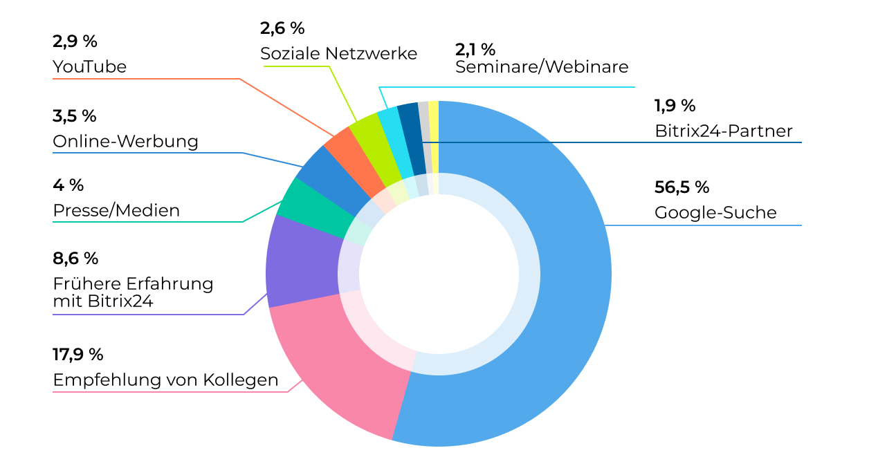 Die Mehrheit der Nutzer (56,5 %) findet Bitrix24 über die Google-Suche, was die Wichtigkeit einer starken Sichtbarkeit in Suchmaschinen und SEO-gesteuertem Marketing zeigt. Dieser Trend betont das zunehmende Vertrauen von Unternehmen in die digitale Recherche bei der Auswahl von Softwarelösungen, da Entscheidungsträger nach detaillierten Vergleichen, Nutzerbewertungen und Funktionsanalysen suchen, bevor sie sich für eine Plattform entscheiden.