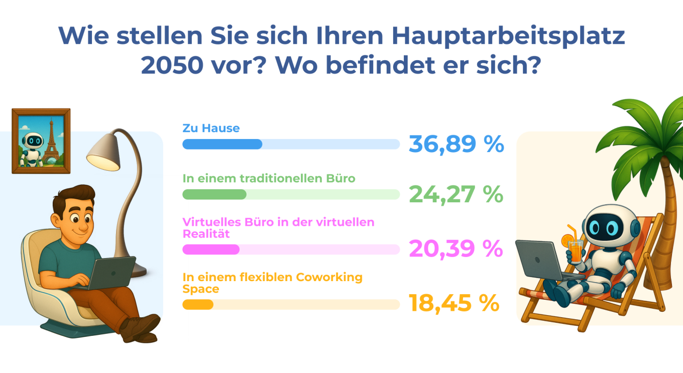 Die Teilnehmer wurden gebeten, auf eine Reihe zukunftsorientierter Fragen zur Arbeit im Jahr 2050 zu antworten. Die Ergebnisse zeigen eine komplexe, aber faszinierende Mischung aus Optimismus, Pragmatismus und Fantasie. Im Folgenden analysieren wir diese Erkenntnisse im Kontext größerer globaler Trends.