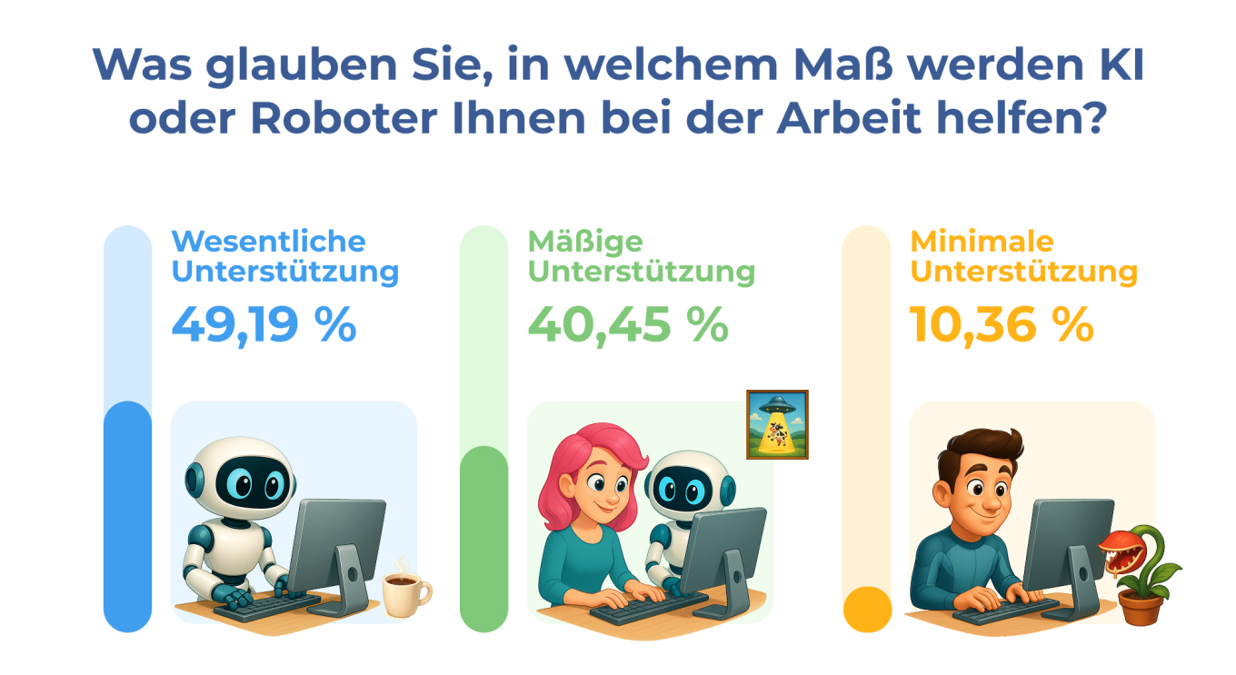 Fast die Hälfte der Befragten (49,19 %) glaubt, dass KI eine erhebliche Unterstützung bieten wird, während nur 10,36 % mit minimaler Unterstützung rechnen. Dies verstärkt die These, dass KI ein integraler Bestandteil der zukünftigen Arbeitsplätze wird – aber nicht unbedingt flächendeckend Arbeiter ersetzen wird, sondern tief in die täglichen Aufgaben eingebettet wird.