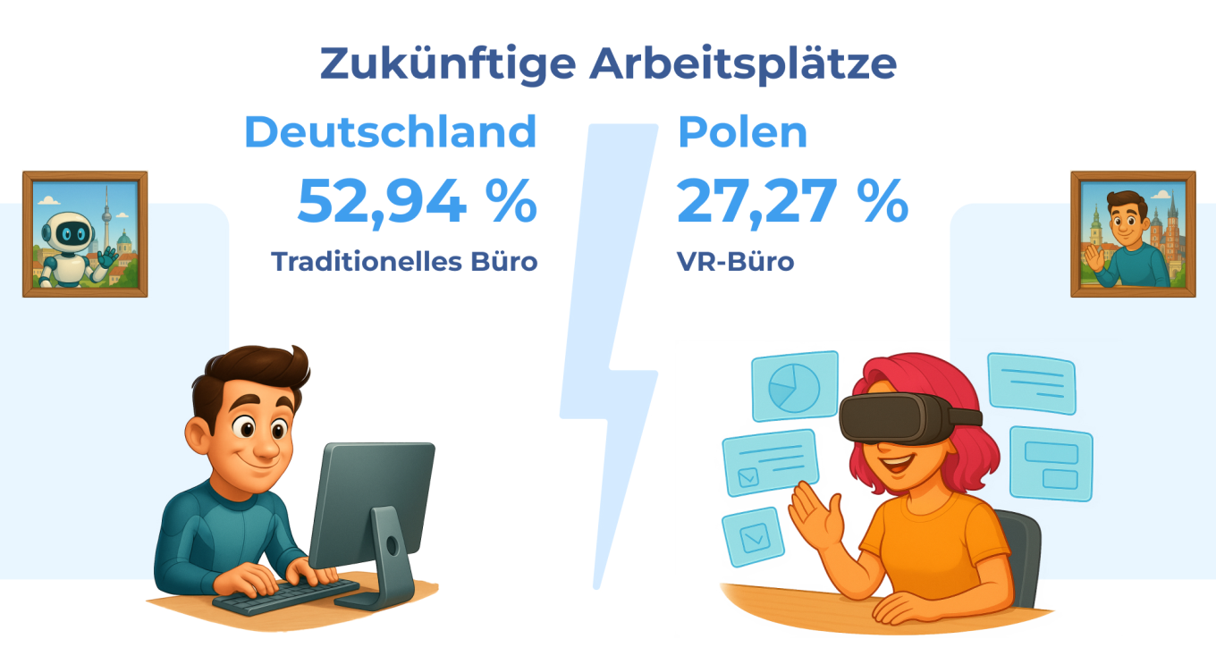Der offene Umgang Polens mit zukunftsorientierten Arbeitsplatzkonzepten könnte mit der jüngeren, technikaffinen Belegschaft zusammenhängen und wird durch intensive Bemühungen um digitale Modernisierung in den letzten Jahren ergänzt. Mit einem wachsenden Start-up-Ökosystem und zunehmenden Investitionen in IT-Infrastruktur könnten die polnischen Befragten eher und begeisterter auf nicht-traditionelle Arbeitsplatzinnovationen reagieren.