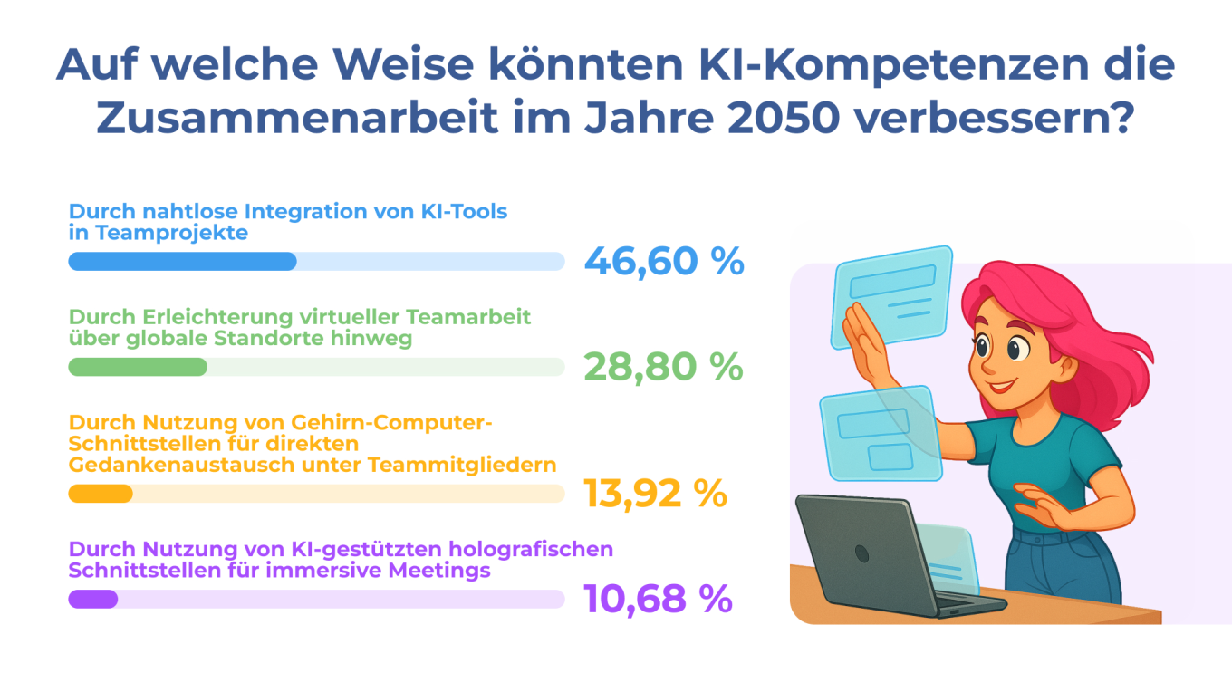 "Reibungslose Integration von KI-Tools in Teamprojekten“ (40,60 %) war die häufigste Antwort und betont die Überzeugung, dass KI zu einer unsichtbaren, unverzichtbaren Komponente der Teamarbeit wird. Gleichzeitig stellten 13,92 % sich Brain-Computer-Interfaces als Kommunikationswerkzeug vor, was eine Offenheit gegenüber den innovativsten, sogar transhumanen Formen der Zusammenarbeit zeigt.