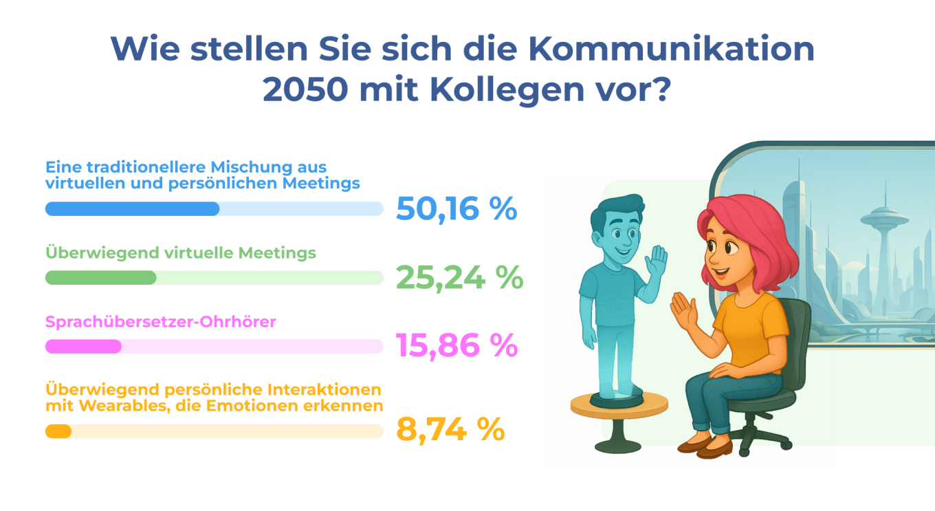 Interessanterweise glauben 15,86 %, dass Echtzeit-Übersetzungs-Kopfhörer großflächig zum Einsatz kommen werden und das Potenzial haben, die globale Zusammenarbeit grundlegend zu verändern. Auch holografische Kommunikation gewann an Zustimmung (25,24 %), was Science-Fiction ähnliche Szenarien widerspiegelt, die in Kürze Realität werden könnten.