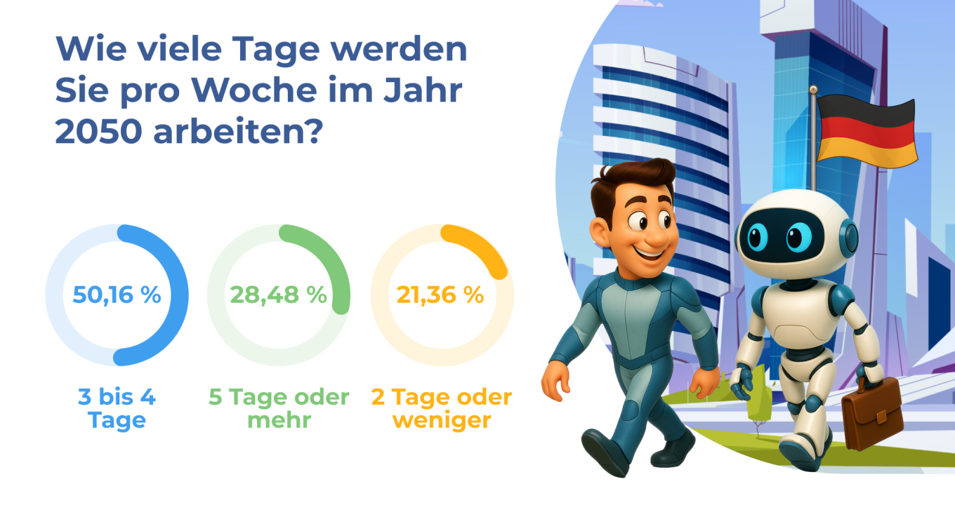 Die beliebteste Antwort war “3 bis 4 Tage“ (50,16 %), gefolgt von "5 Tage oder mehr" (28,48 %) und "2 Tage oder weniger" (21,36 %). Dies deutet darauf hin, dass viele Arbeitnehmer einen Übergang zu kürzeren Arbeitswochen erwarten, möglicherweise aufgrund gesteigerter Effizienz durch KI oder sich wandelnder gesellschaftlicher Werte im Hinblick auf Work-Life-Balance.
