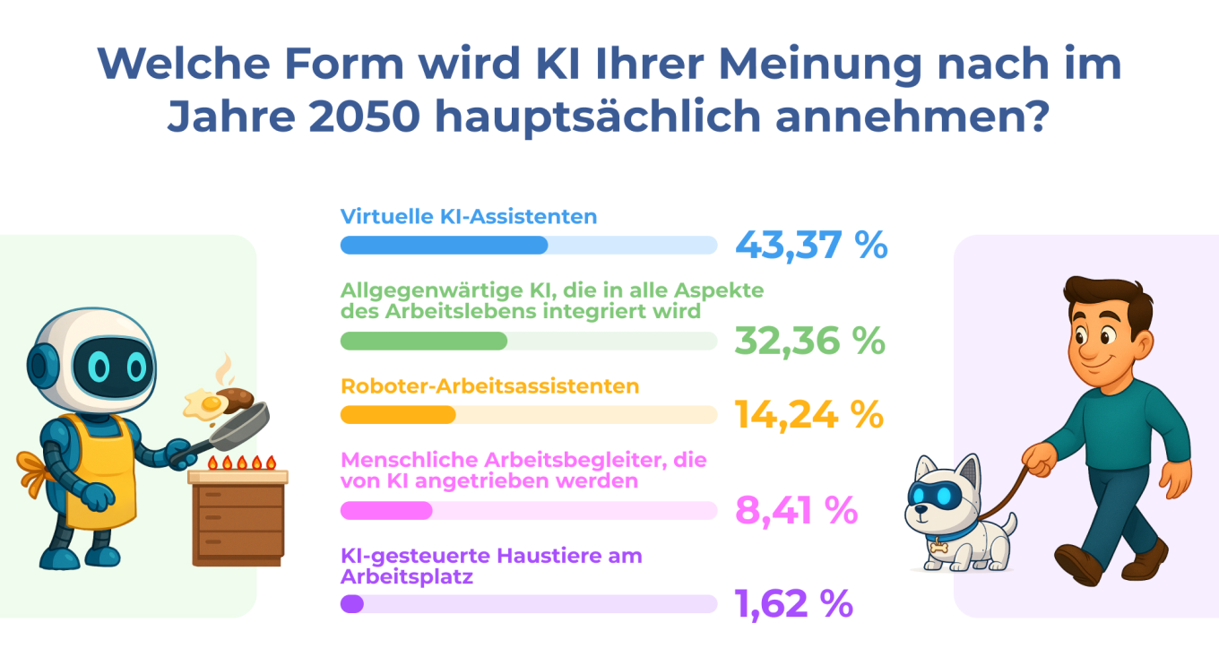 Virtuelle KI-Assistenten (43,37 %) und allgegenwärtige KI (32,36 %) dominierten die Antworten. Dies deutet auf eine Zukunft hin, in der KI sowohl sichtbar (über Schnittstellen) als auch umgebend (unauffällig im Hintergrund) ist.