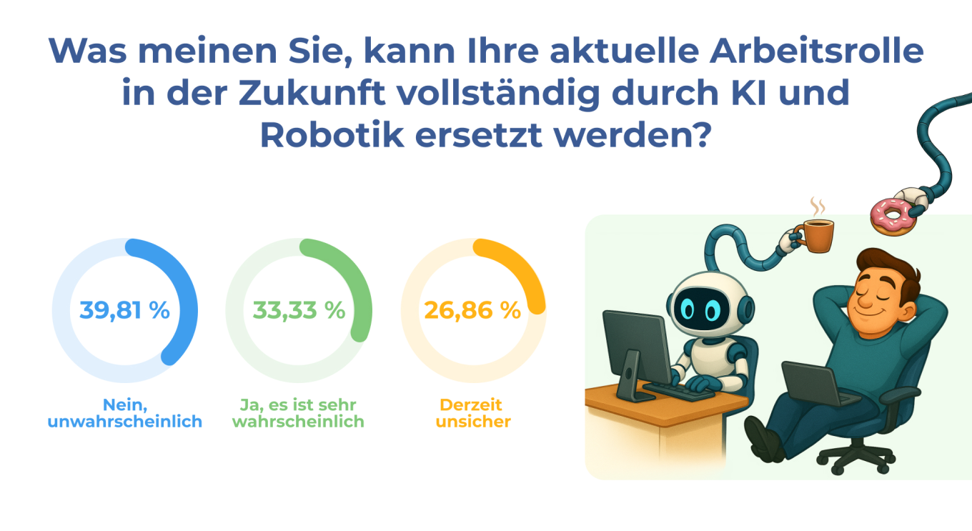 Etwa ein Drittel (33,33 %) sagte, dass eine vollständige Automatisierung “sehr wahrscheinlich“ sei, während 39,81 % dieser Ansicht nicht zustimmten. Der Rest (26,86 %) war sich unsicher. Diese vorsichtige Aufteilung unterstreicht die gemischten Gefühle, die im Zusammenhang mit Arbeitsplatzsicherheit in einer KI-dominierten Welt bestehen.
