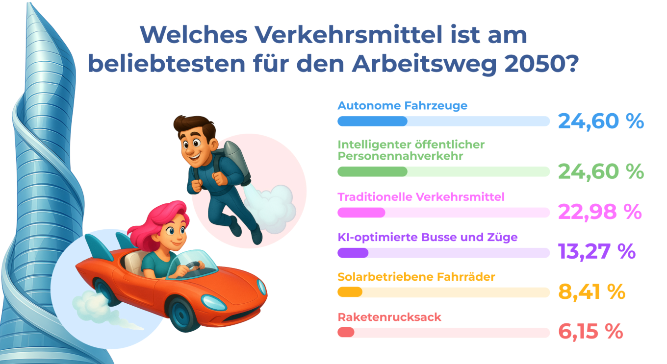 Die Tatsache, dass traditionelle Verkehrsmittel immer noch 22,98 % der Stimmen erhielten, zeigt, dass nicht jeder an eine bevorstehende Veränderung glaubt und zukunftsträchtigere Optionen wie Jetpacks (6,15 %) deuten darauf hin, dass einige der Befragten in mutige Spekulationen abdriften.