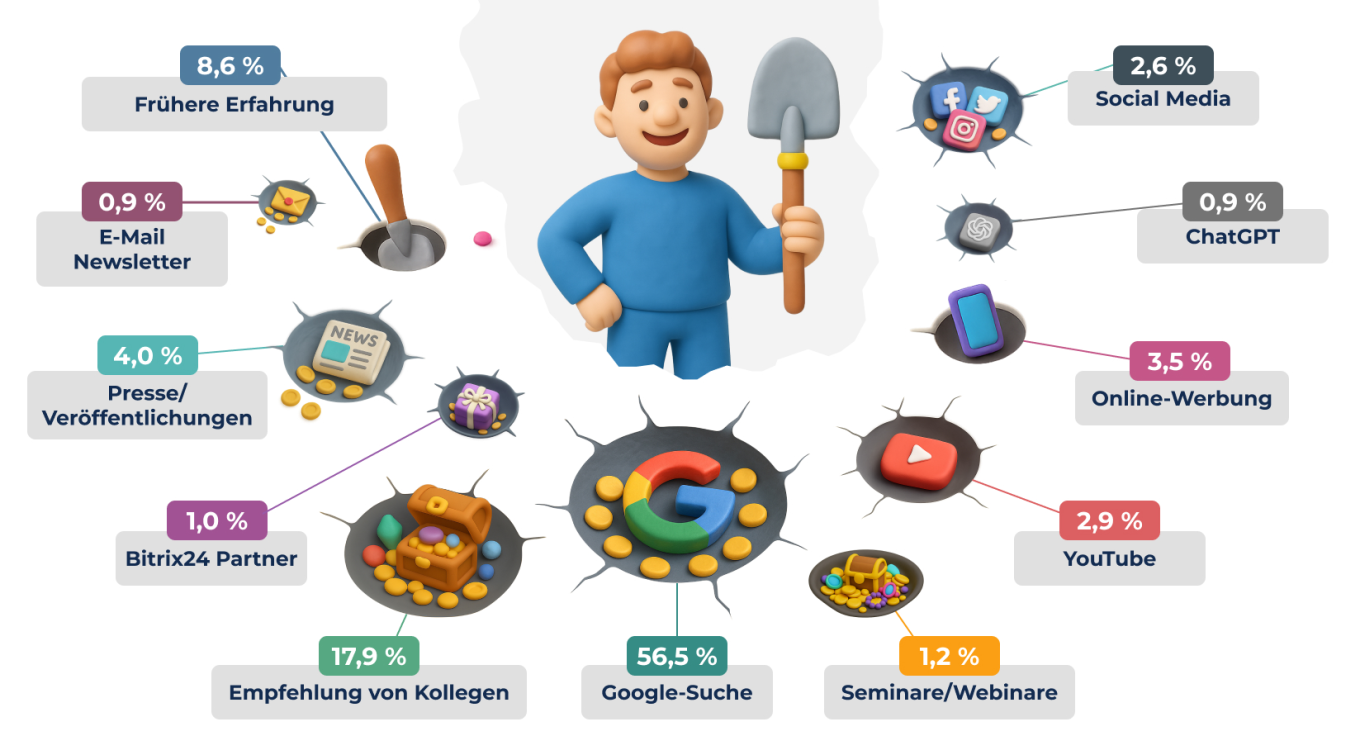 Mehr als 56 % der Unternehmen haben das Bitrix24 CRM über die Google-Suche gefunden, was auf einen starken Bedarf nach CRM-Lösungen hindeutet. Empfehlungen von Kollegen spielen ebenfalls eine wichtige Rolle, da fast 18 % der Nutzer aufgrund von Mundpropaganda zu Bitrix24 wechseln. Diese Daten zeigen das wachsende Bewusstsein dafür, dass CRM eine überlegene Alternative zu Excel-Tabellen ist.