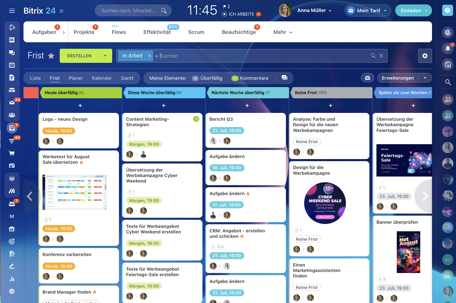 Bitrix24 hat alles, was ein Team braucht, um an Projekten zusammenzuarbeiten – egal, ob Sie im Büro, im Homeoffice oder im Hybridmodus arbeiten.