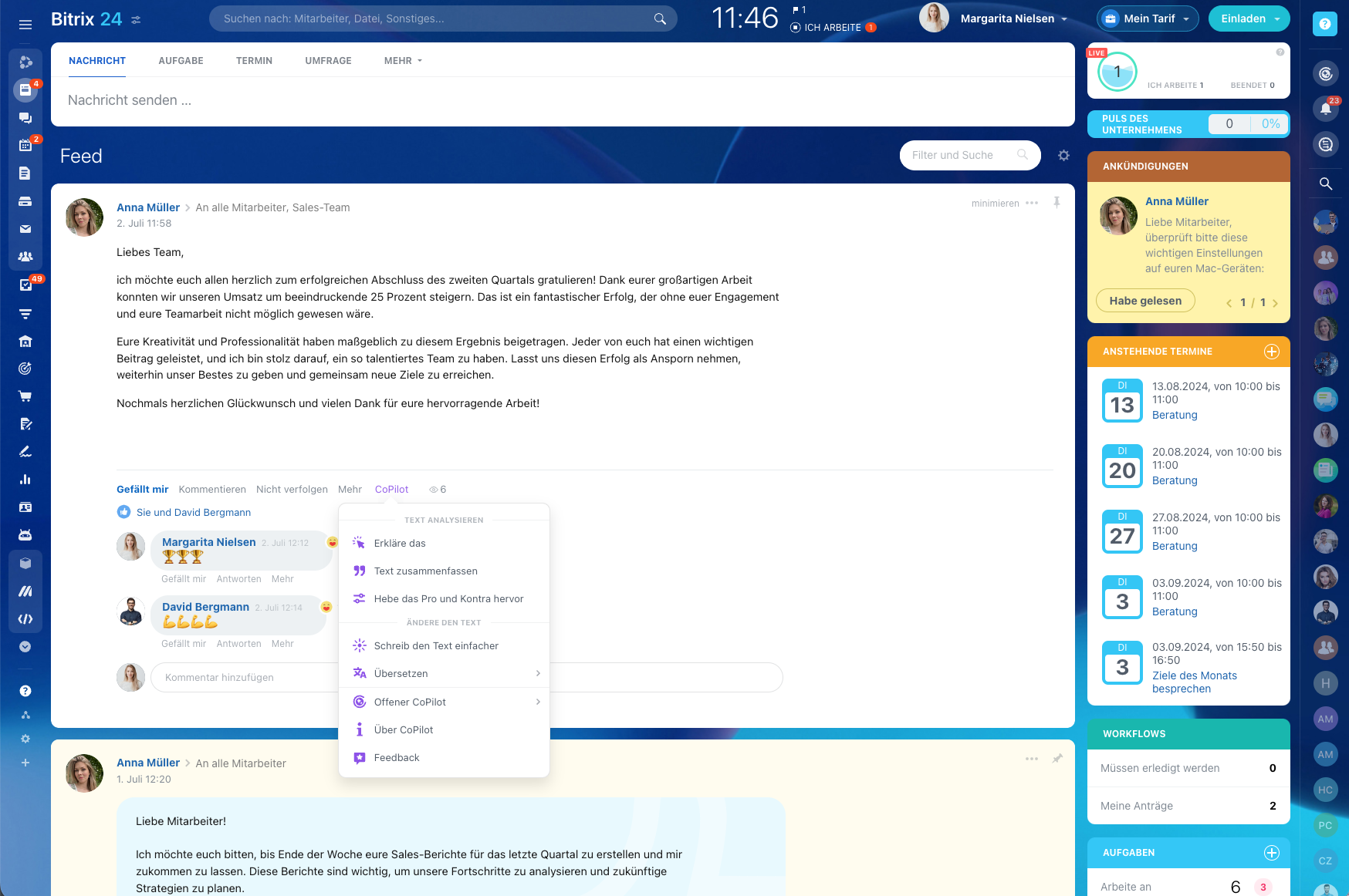 Kommentare im cloudbasierten Bitrix24 Arbeitsplatz sind eine schnelle und einfache Möglichkeit, arbeitsbezogene Probleme zu besprechen und wichtige Informationen mit Ihrem Team zu teilen. Likes, Reaktionen und Zitate verleihen der üblichen Bürokommunikation eine menschliche Note.