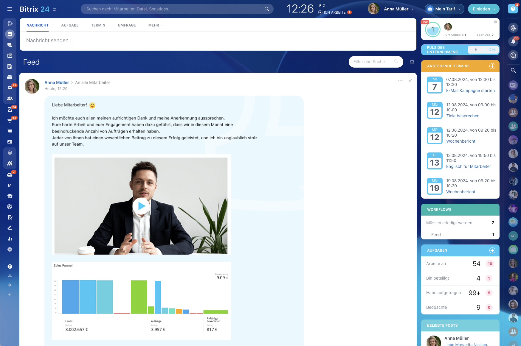 Ihr Feed in der Bitrix24 Arbeitsplattform wird basierend auf den Gruppen, denen Sie beigetreten sind, der Abteilung, in der Sie sich befinden, usw. personalisiert. Sie können Nachrichten an alle Mitarbeiter oder ausgewählte Nutzer/Gruppen schreiben.