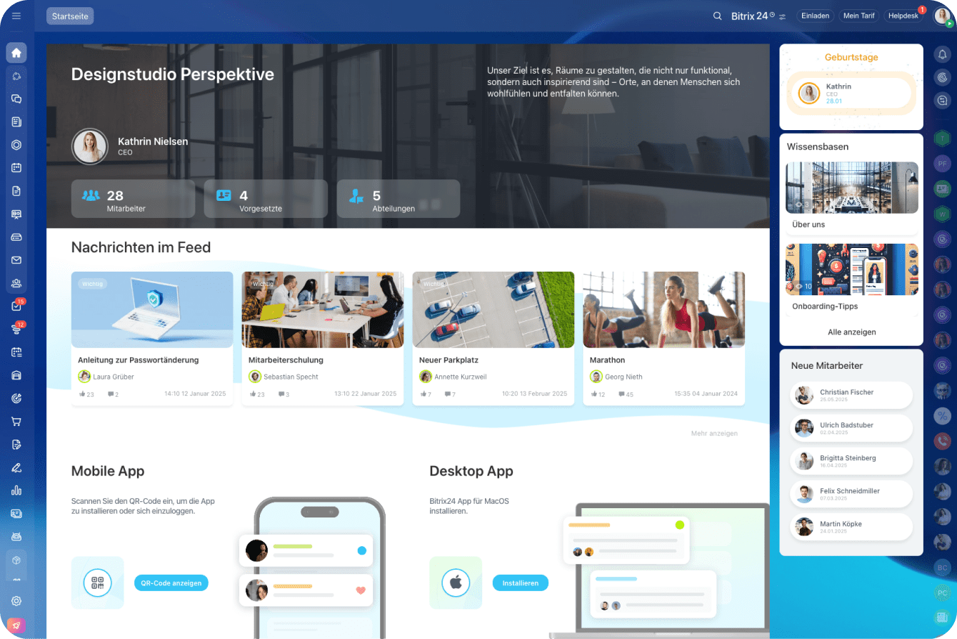 Die Startseite gibt Ihnen einen umfassenden Überblick über die Tätigkeit des Unternehmens. Mit Widgets wie Mitarbeiteraktivität, Geburtstagen und weiteren können Sie sowohl für bestehende Mitarbeiter als auch für Neueinsteiger ein warmes, einladendes Erlebnis schaffen.
