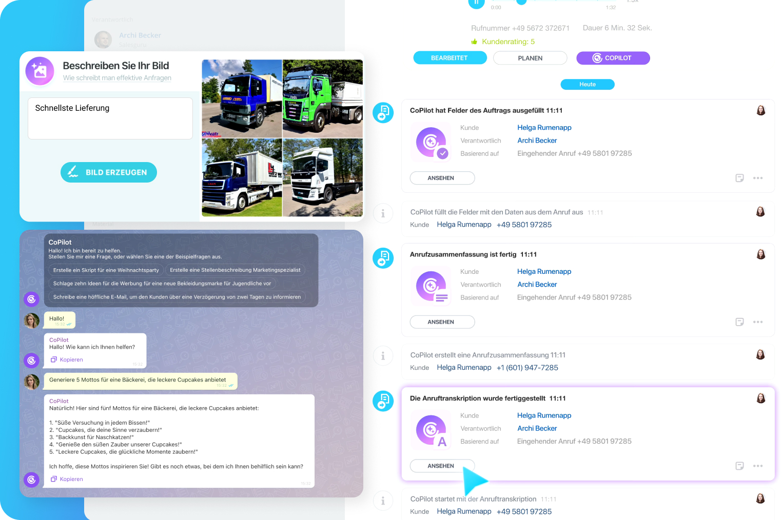 Verwenden Sie unseren kostenlosen KI-gestützten Assistenten CoPilot, um überzeugende Marketingtexte zu erstellen, neue Ideen zu generieren und Telefonanrufe in Ihrem CRM zu transkribieren, wobei die Felder im jeweiligen Lead oder Auftrag automatisch ausgefüllt werden. Das KI-Scoring-Tool hilft Ihnen bei der Umsatzprognose.