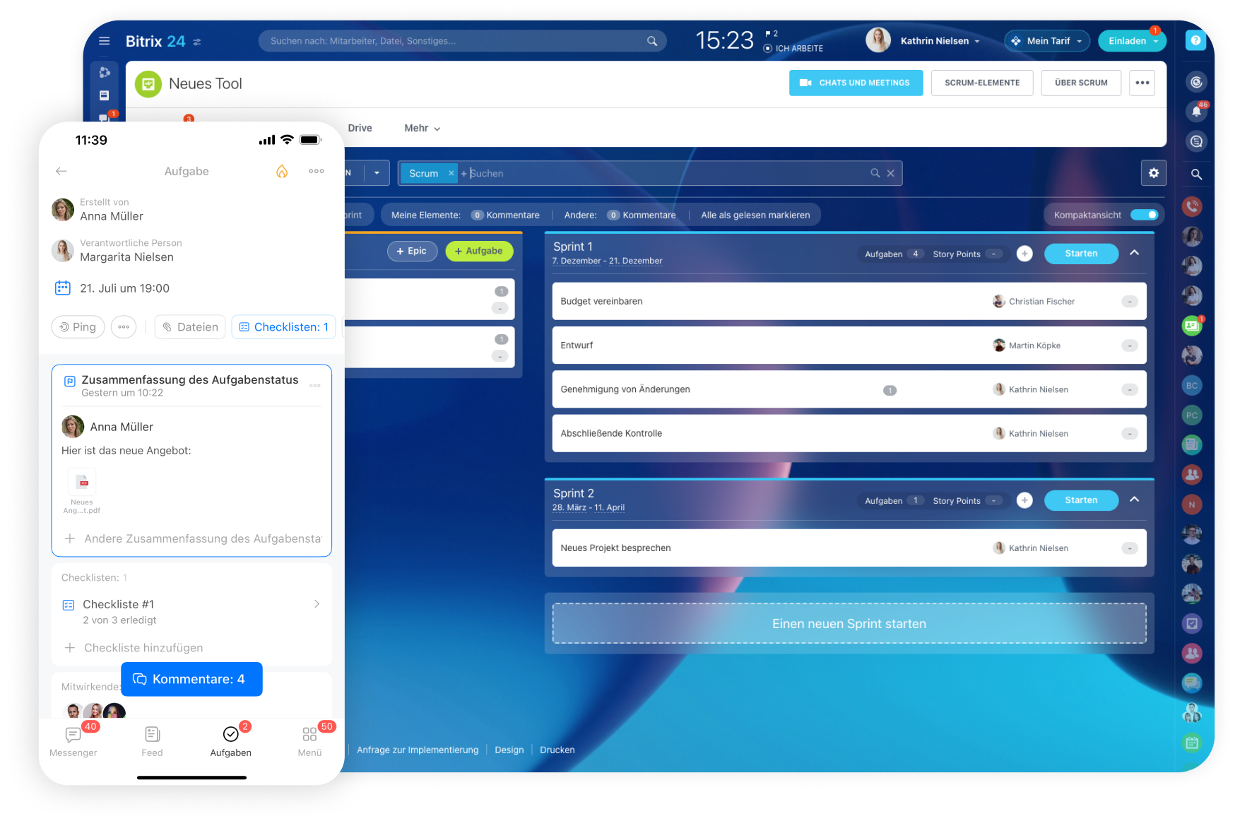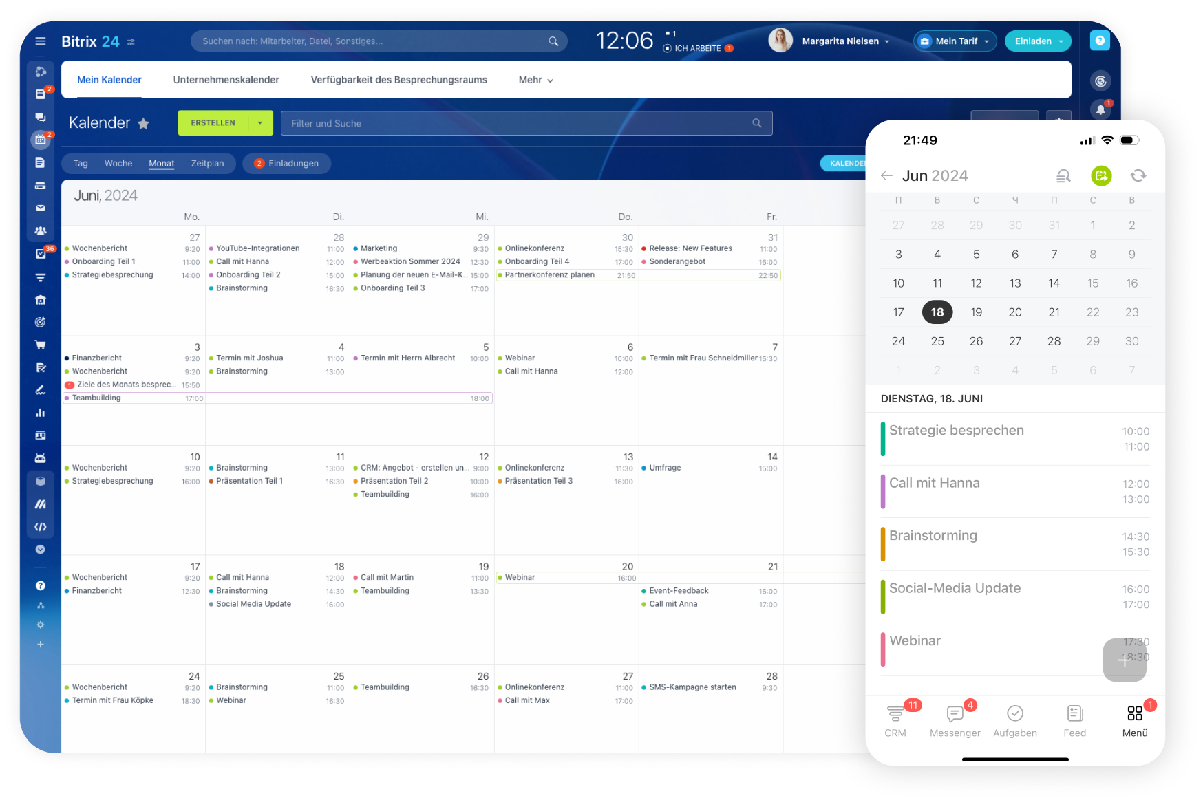 Organisieren Sie Besprechungen und Veranstaltungen mit Stil und Leichtigkeit, planen Sie Ihren Tag und verwalten Sie Ihre Arbeitsbelastung, kommunizieren Sie mit Ihrem Team und arbeiten Sie mit externen Nutzern zusammen – alles mit Bitrix24.