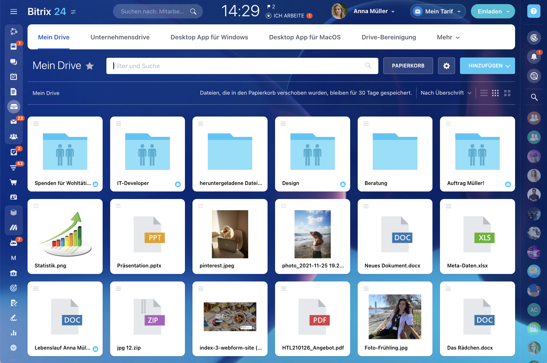Der Bitrix24 Drive ist der Ort, an dem Sie alle arbeitsbezogenen Dateien erstellen, bearbeiten und freigeben können. Leicht zugänglich von jedem Gerät aus, integriert mit Google Docs, Office 365 und mit anderen Bitrix24-Tools - alles, was Sie sich von einem Dateispeicher wünschen, ist hier.