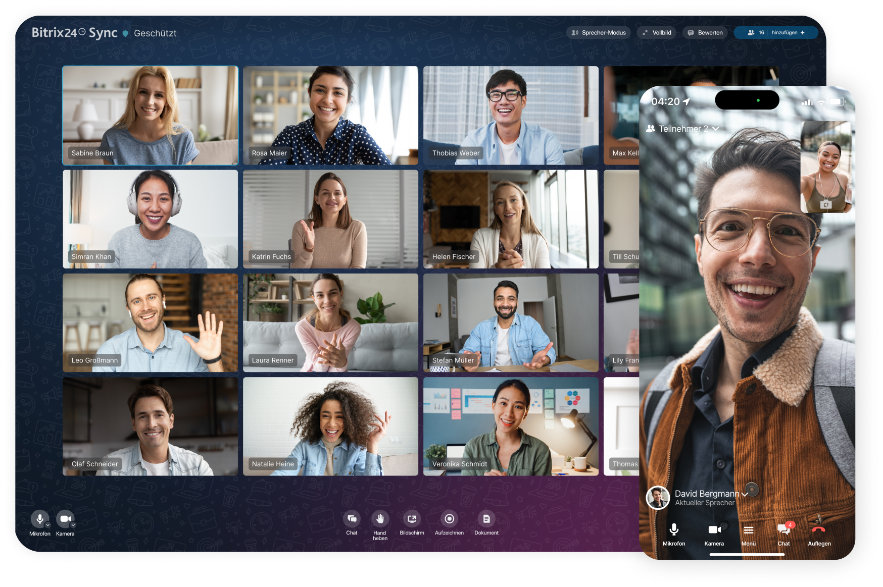 Übertragen Sie Ihren Bildschirm während einer täglichen Besprechung, um Ihren Kollegen wichtige Informationen zu zeigen. Die Besprechung kann aufgezeichnet und auf Ihrem Bitrix24 Drive gespeichert werden.