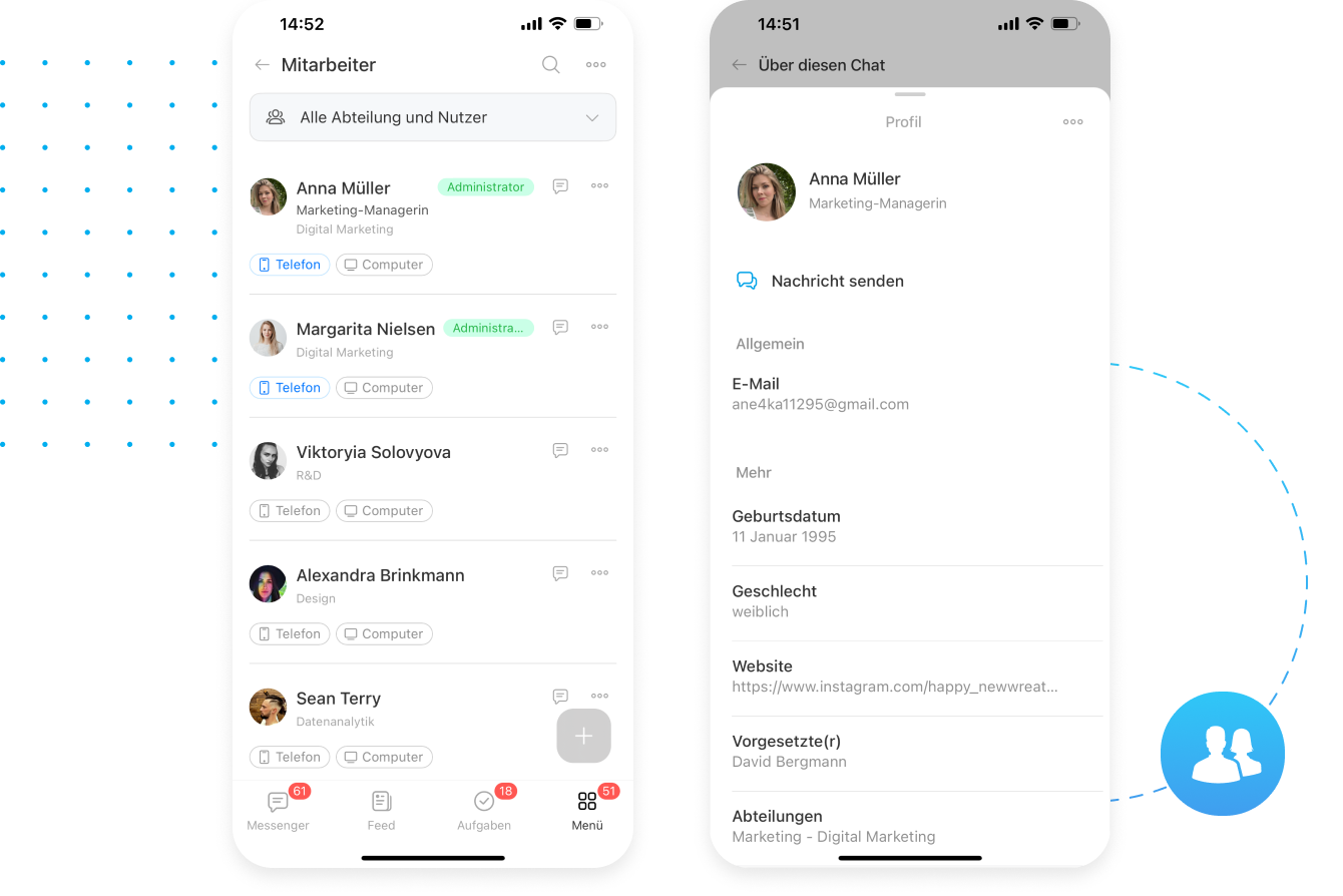 Zentralisiertes, durchsuchbares Mitarbeiterverzeichnis für den schnellen Zugriff auf Mitarbeiterdaten, einschließlich Kontaktdaten, Aufgaben, Kalender, Arbeitsgruppen, Drive und deren Aktivitäten im Feed.