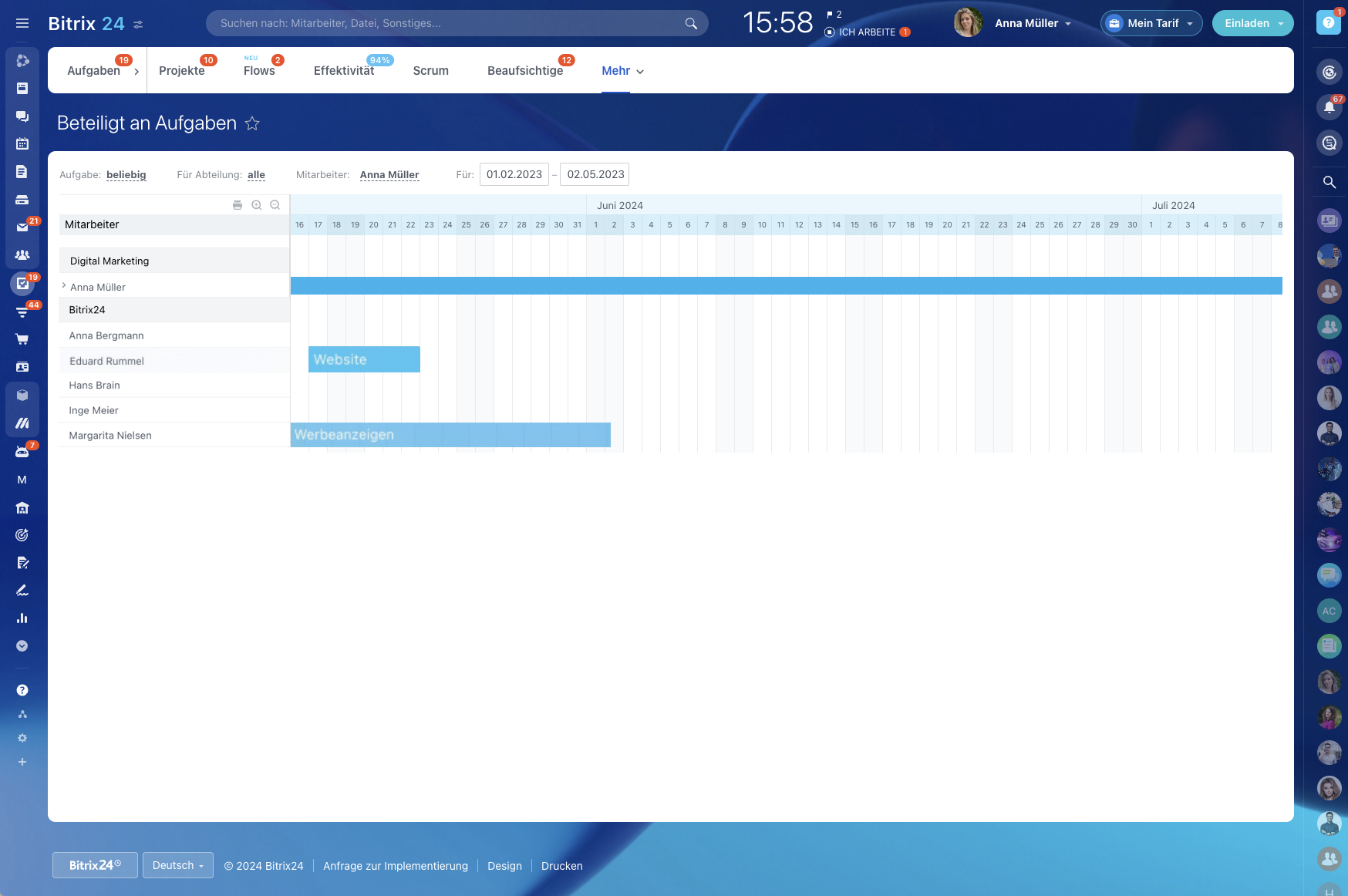 Bitrix24 verfügt über ein Diagramm, das die Beteiligung an Aufgaben mit einer detaillierten Aufschlüsselung nach jedem Mitarbeiter zeigt, sodass Sie sehen können, wer was zu einem bestimmten Zeitpunkt tut und wie beschäftigt er ist.
