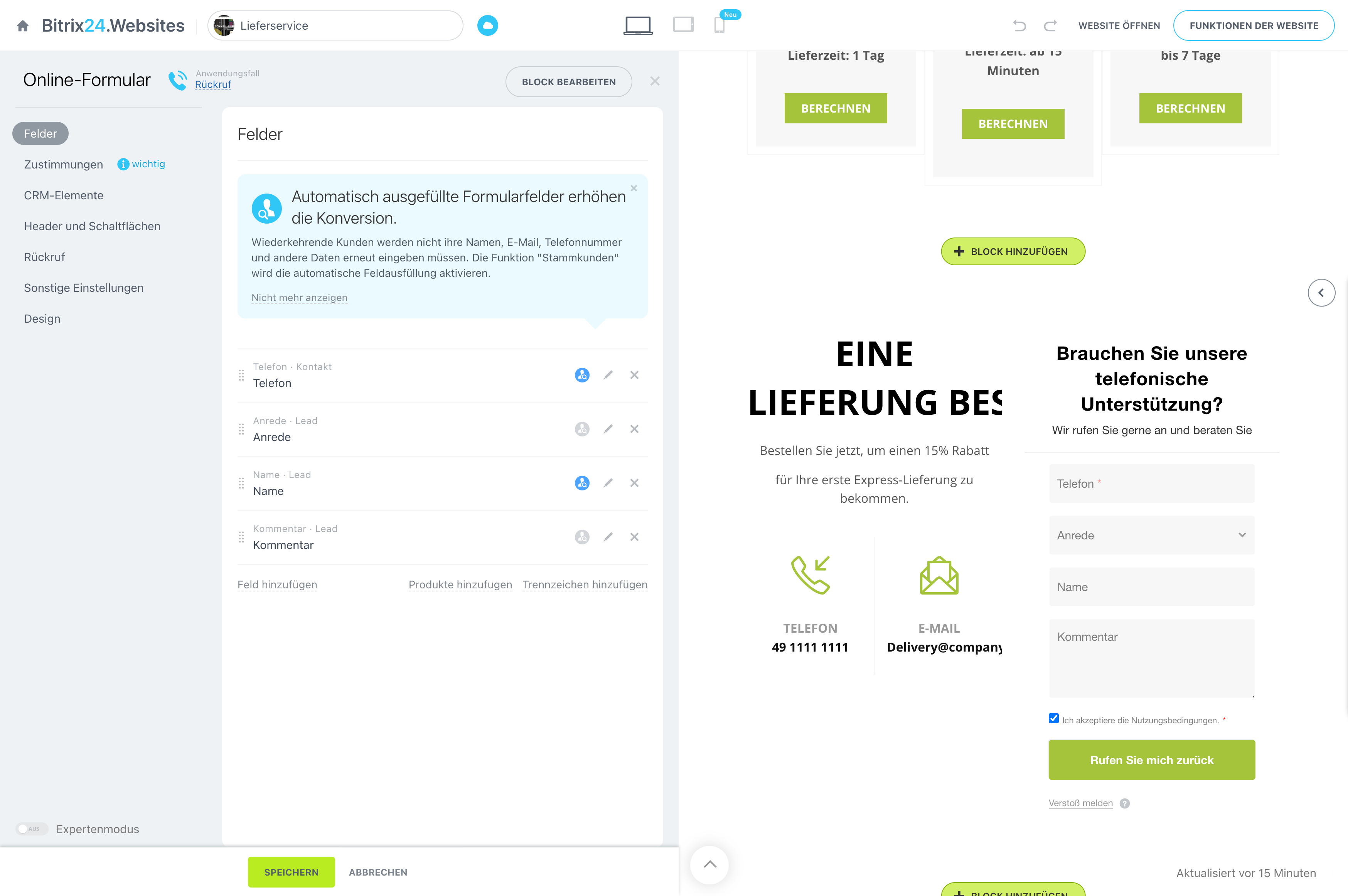 Dank der Integration mit unserem CRM und den restlichen Bitrix24 Tools können Sie einen automatisierten Funnel einrichten und Ihre Kunden vom ersten Besuch bis zum Wiederholungsauftrag führen.
