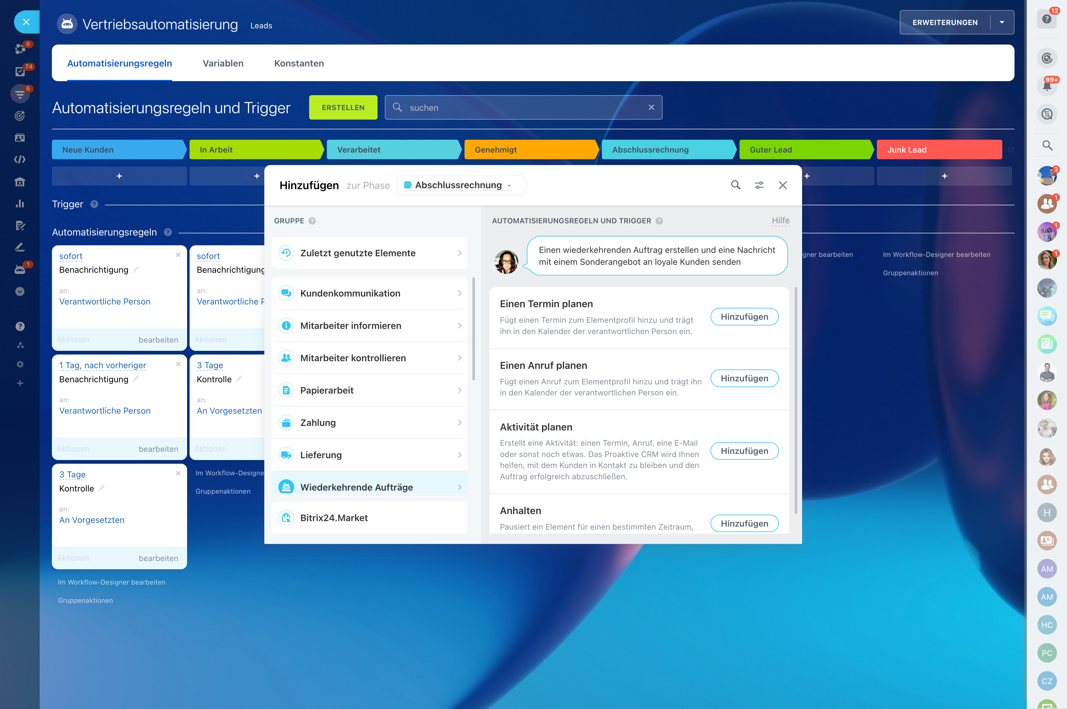 (z. B. "Eine E-Mail oder SMS an den Kunden senden"), die aktiviert wird, sobald ein Lead (oder Auftrag) einen neuen Status in der Vertriebspipeline erhält. Automatisierungsregeln können die Aktivierungszeit und die Aktion festlegen: Aufgabe, Benachrichtigung, E-Mail, Anruf oder eine andere Aktion Ihrer Wahl.