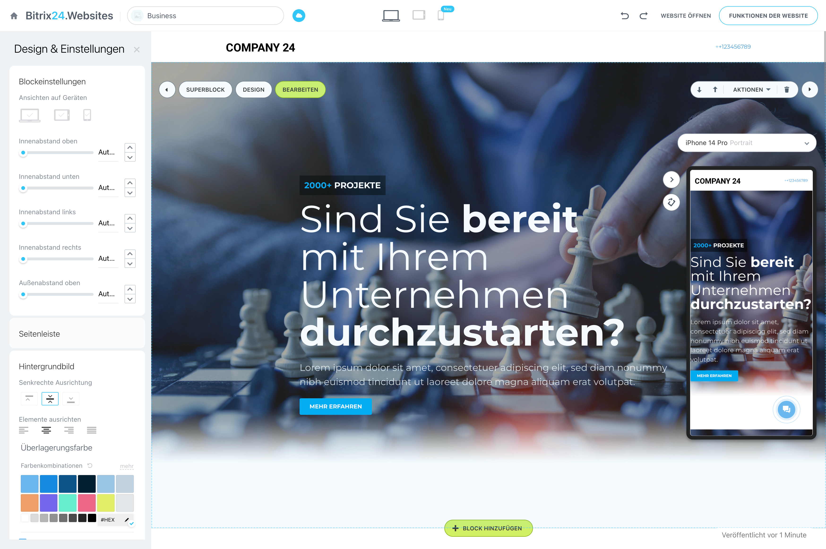 In unserem kostenlosen Landingpage-Builder können Sie Elemente hinzufügen, entfernen und anpassen. Sie können Schriften, Stile und Farben ändern, Bilder, Videos und Texte hinzufügen – der ganze Prozess ist einfach und intuitiv verständlich.