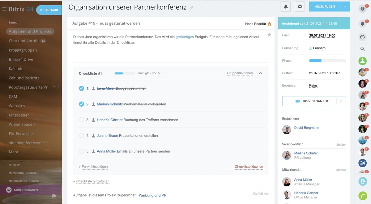 Bitrix24 Kanban Board-Ansicht in Aufgaben ist für eine unbegrenzte Nutzeranzahl absolut und dauerhaft kostenlos, inkl. 5 GB online Speicherplatz für Ihre Dokumente. Es ermöglicht Ihnen, alle Aufgaben und sogar Kundendaten, die Sie im integrierten CRM einpflegen können, mit einem Blick einzuschätzen, in eine andere Phase zu verschieben oder einfach zu schließen.
