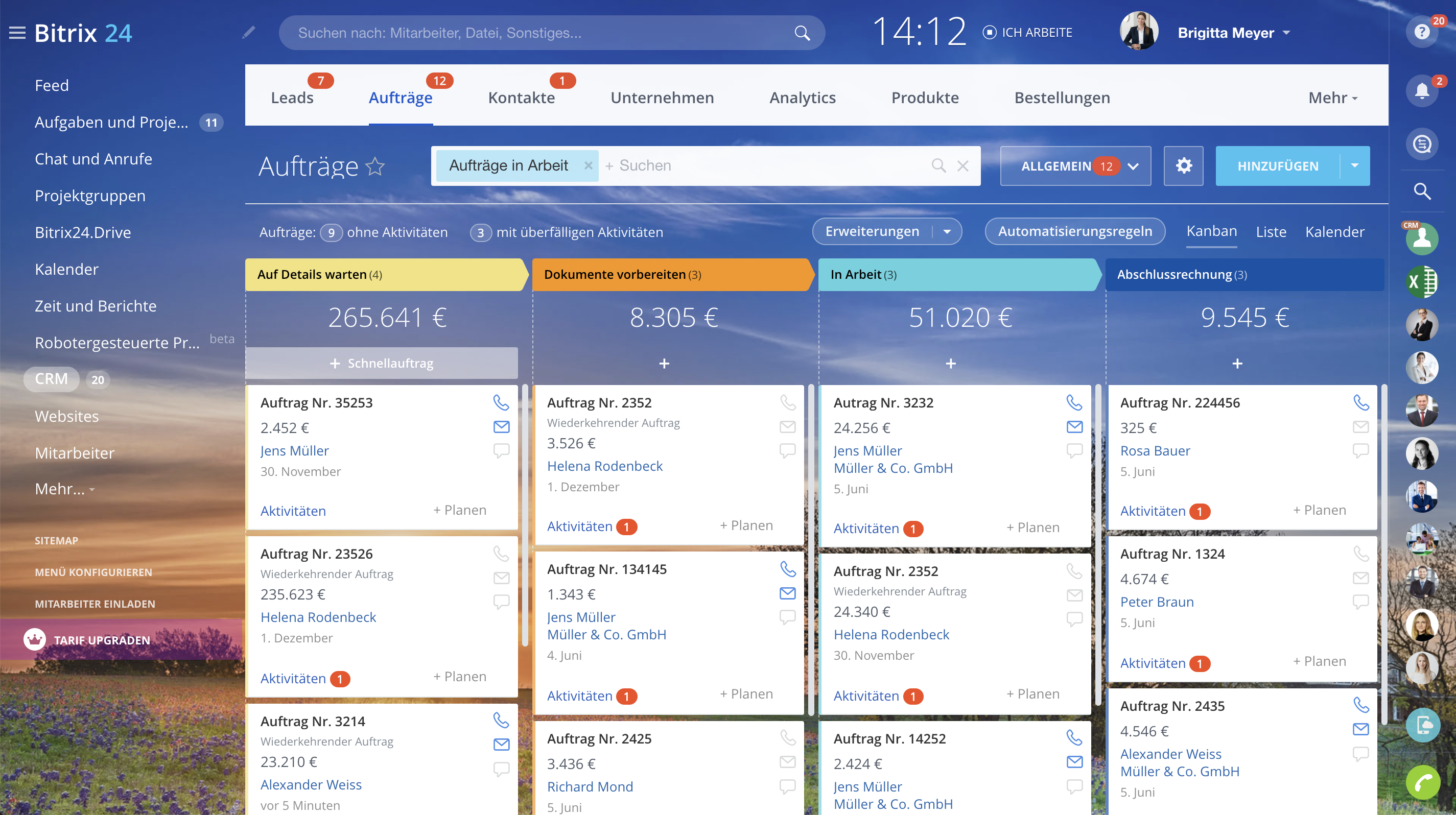 Kanban Board ist für Leads, Aufträge und Rechnungen in Bitrix24 vorhanden: für alle Elemente mit dem Status. Kanban Board zeigt auch, wie viele und welche dieser Elemente in der einen oder anderen Phase sind.